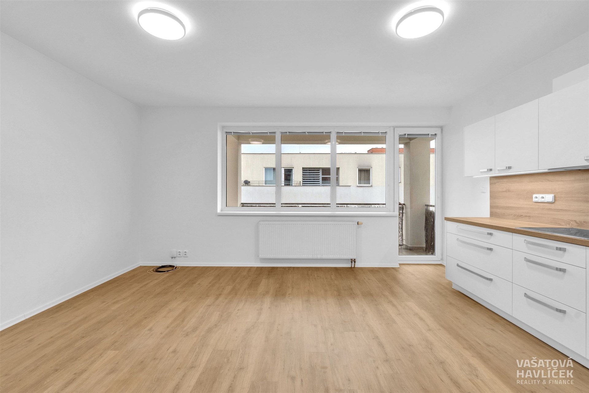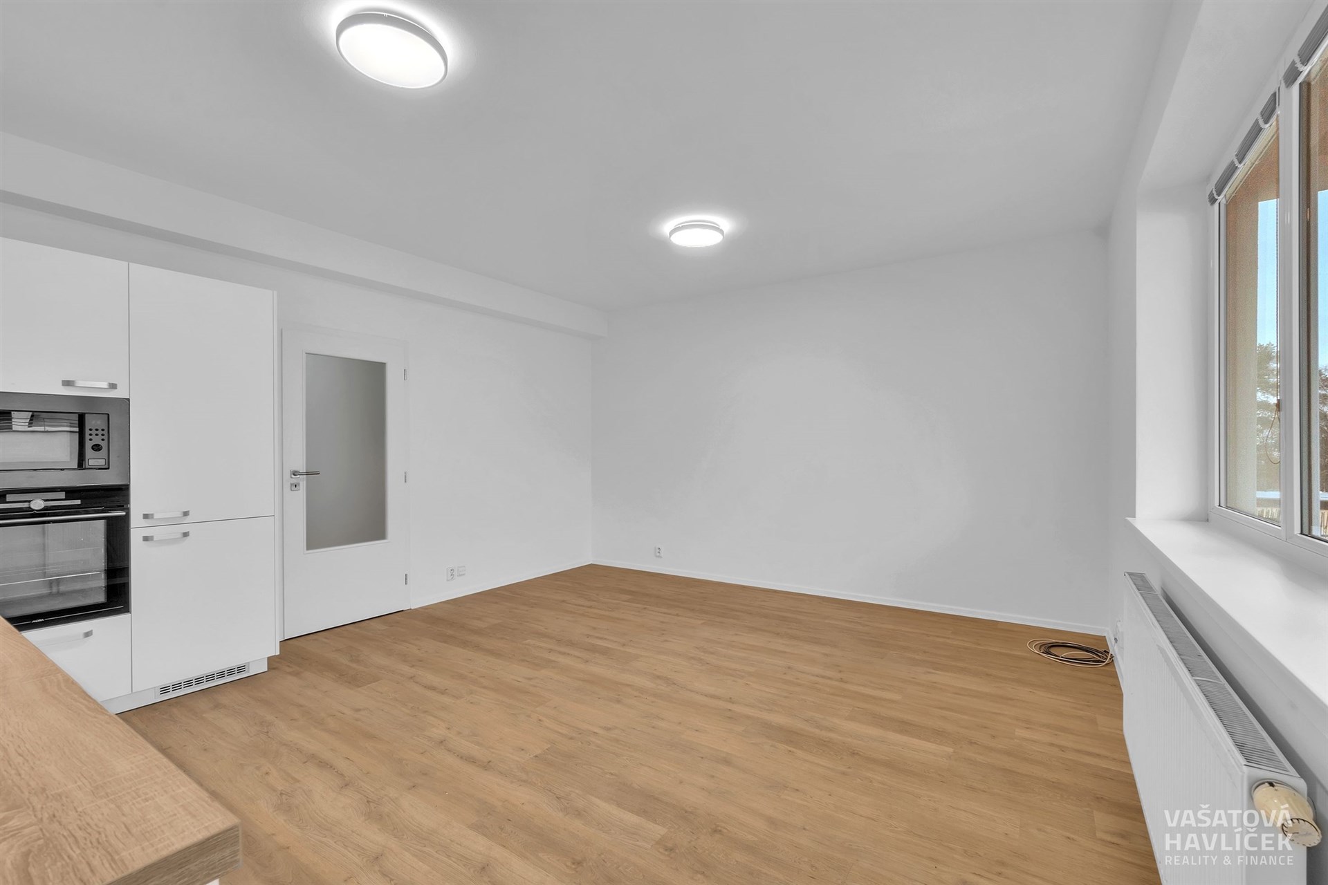 > nová kuchyňská linka s vestavěnými spotřebiči (trouba, indukční deska, myčka, lednice s mrazákem, digestoř, mikrovlnná trouba)