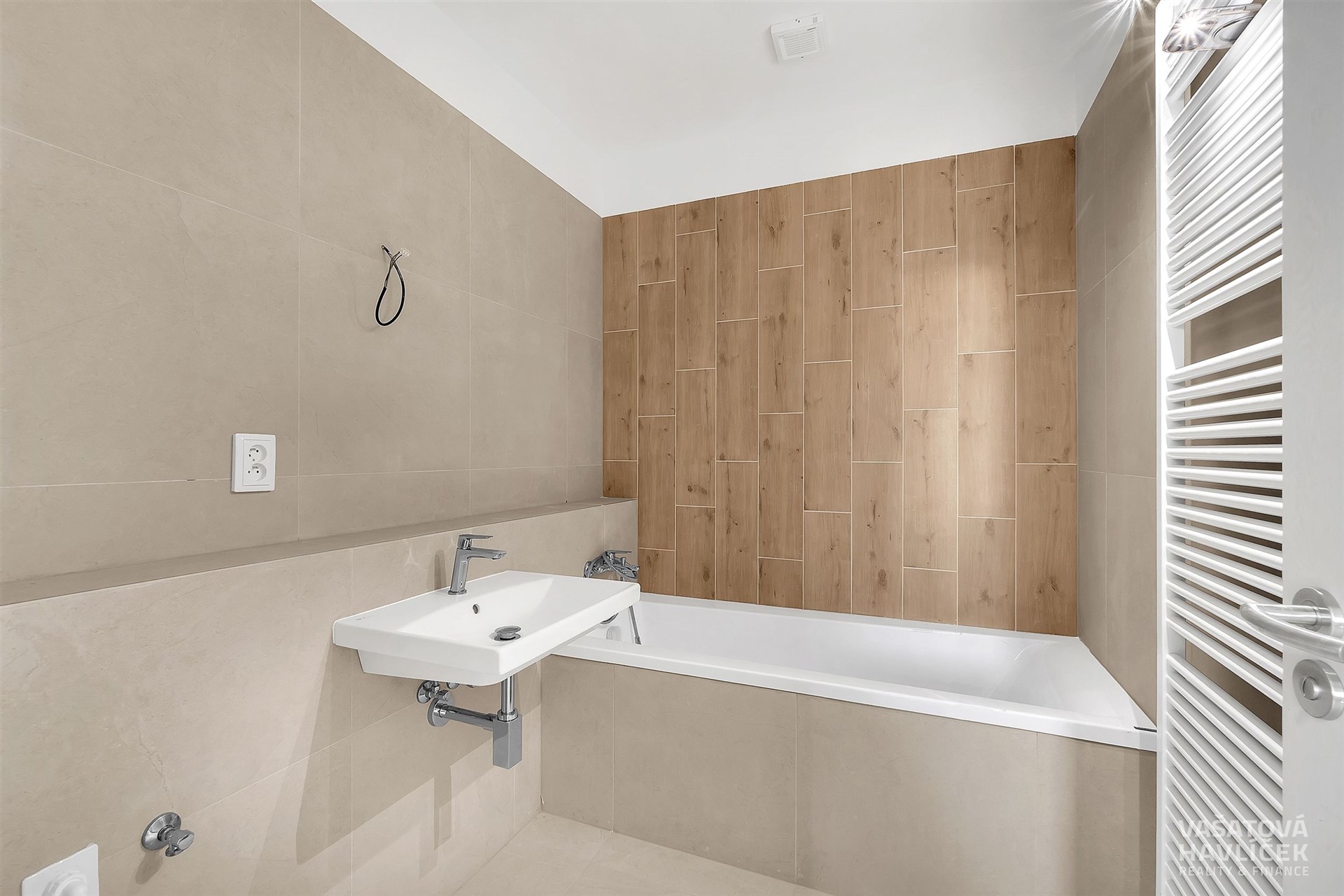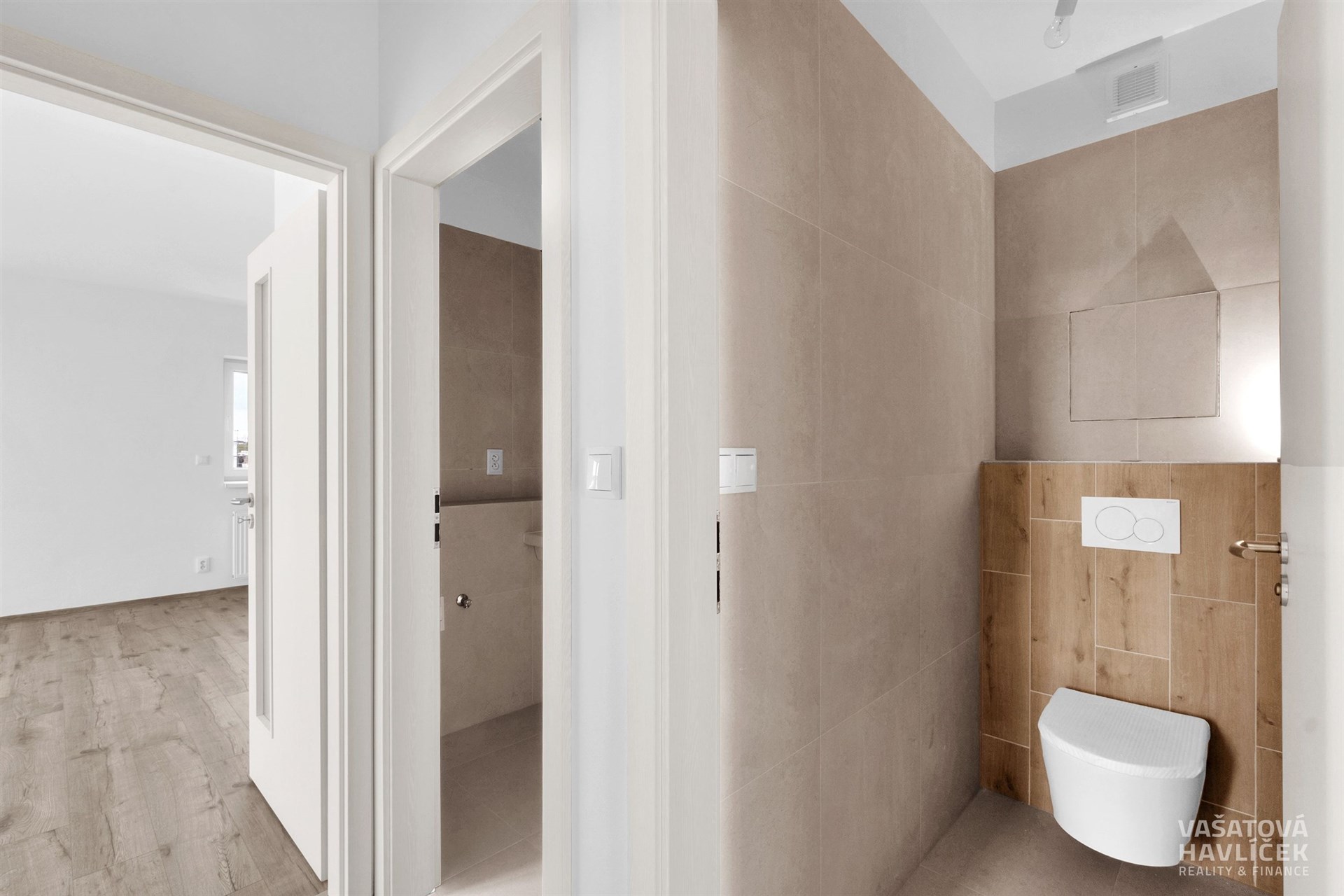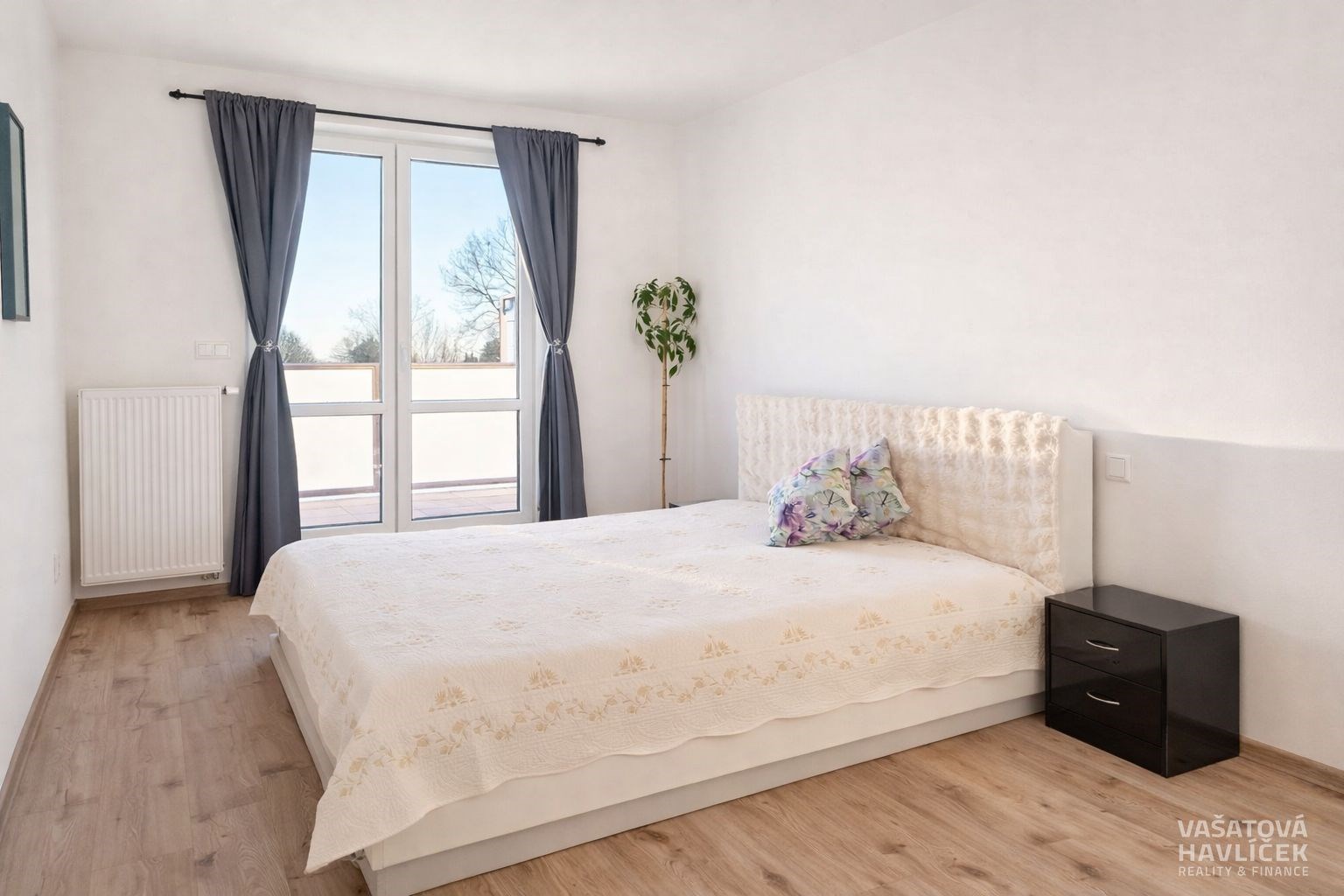Dispozice bytu: obývací pokoj s velkou terasou (30 m²) je orientován na jih a je řešen velkoformátovým prosklením; ložnice, dětský pokoj a menší terasa (10 m²) jsou orientovány na východ. V bytě je nainstalovaná nová kuchyňská linka, indukční varná deska, digestoř Mora a trouba Mora. Koupelna je vybavena vanou, umyvadlem, prostorem pro pračku a žebříkovým radiátorem. Byt má úložné prostory, které lze využít jako šatnu, komoru příp. pracovnu. V obytných pokojích je vinylová podlaha, v chodbě a koupelně je položena dlažba. Součástí prodeje může být po vzájemné dohodě také vybrané vybavení bytu. Topení a ohřev vody zajišťuje domovní plynový kotel s centrální přípravou teplé užitkové vody.