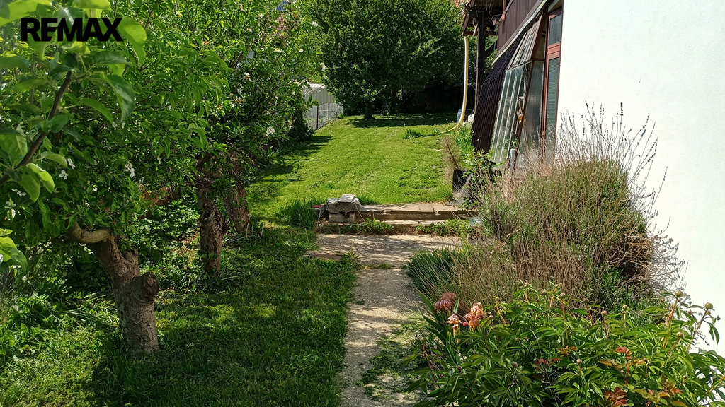 Pozemek je kompletně oplocen, přístup je z asfaltové komunikace plechovými vraty. Zahrada je osázená okrasnými dřevinami a ovocnými stromy.