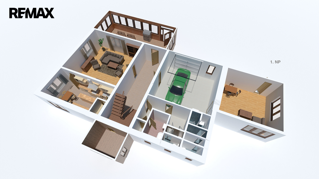 - obývací pokoj + kuchyně + pokoj + soc. zařízení + garáž + kůlna