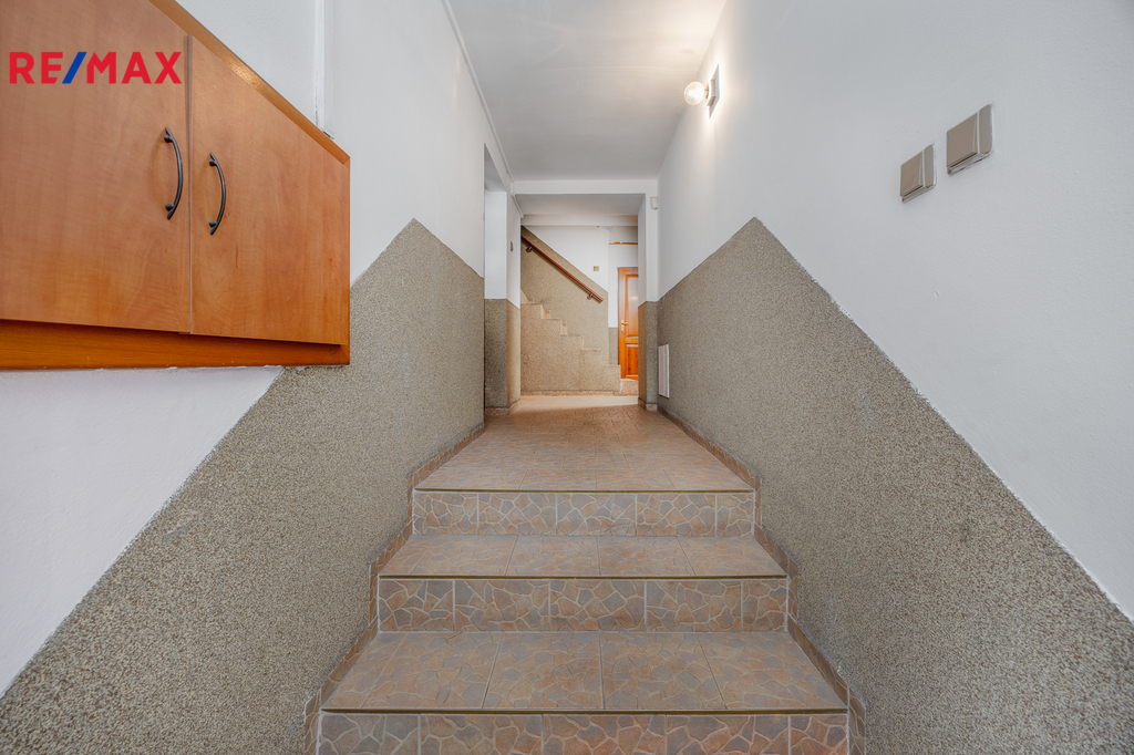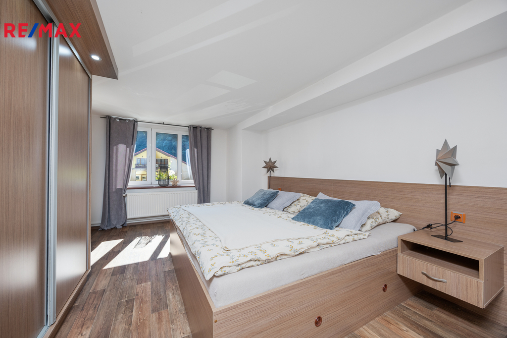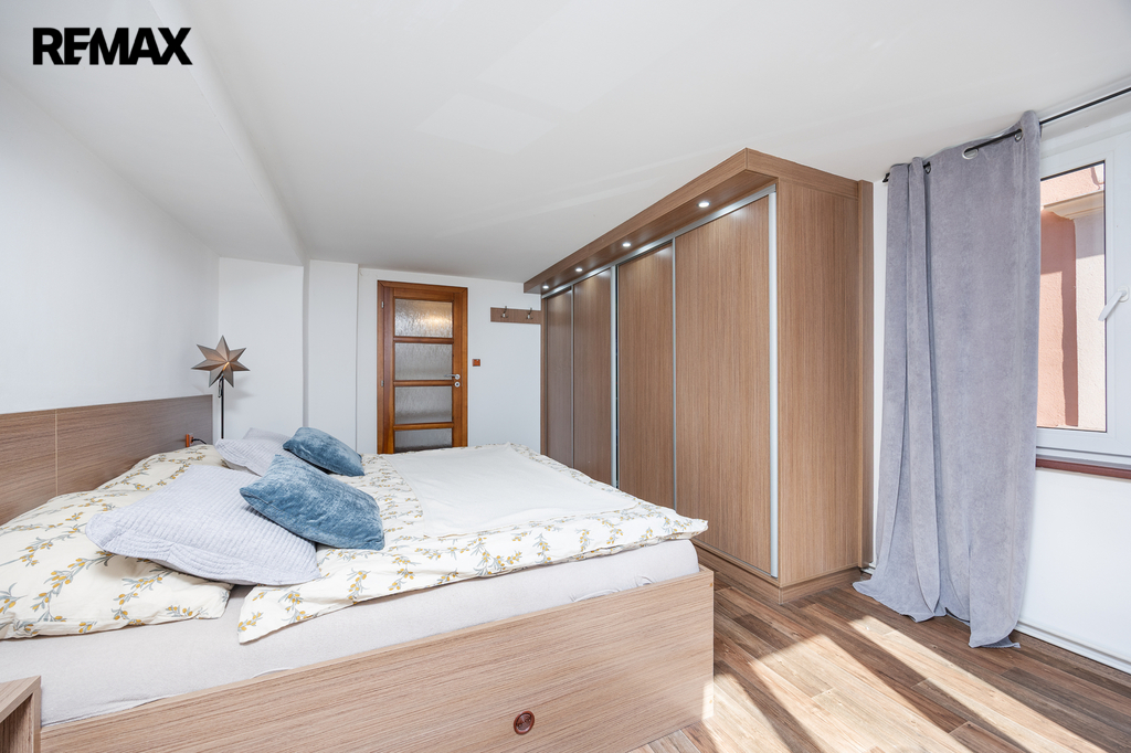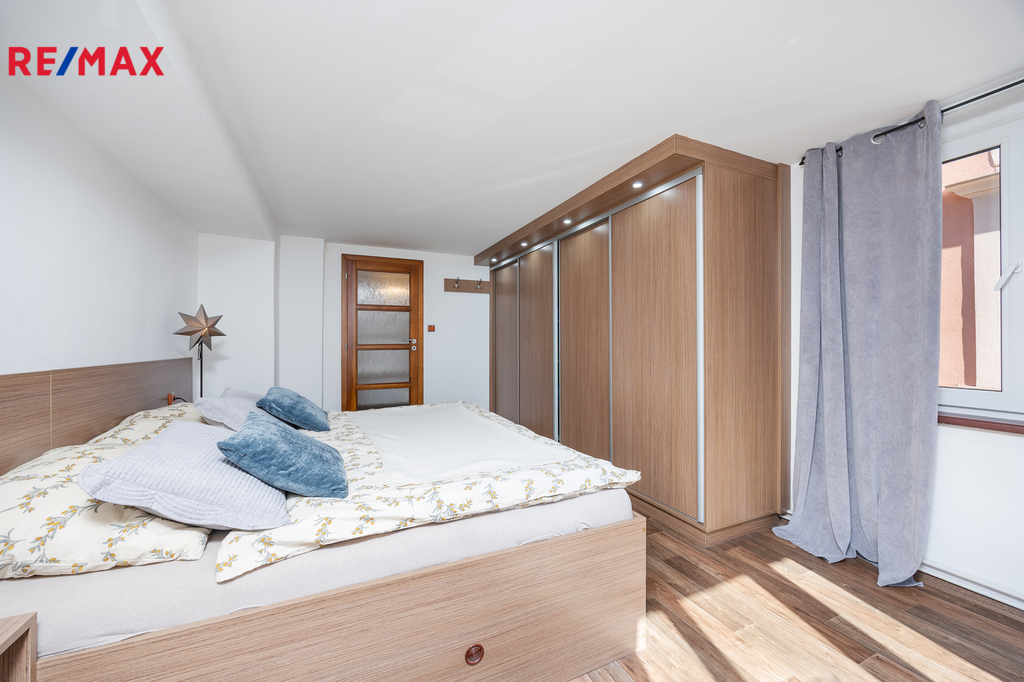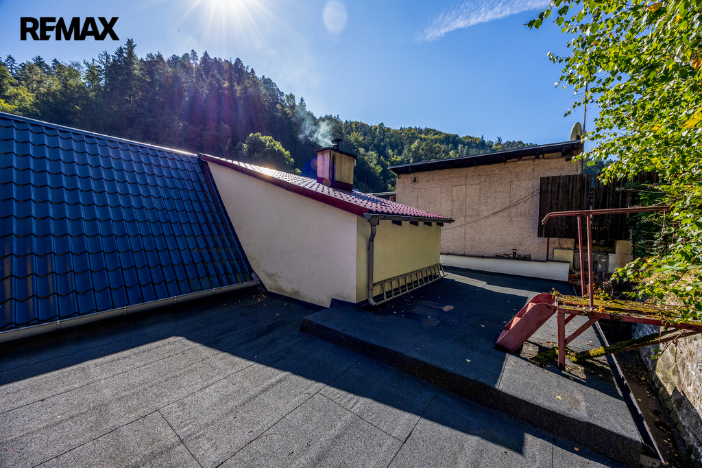 Součástí domu je také prostorná půda se vstupem na střešní terasu a zahrádku za domem.