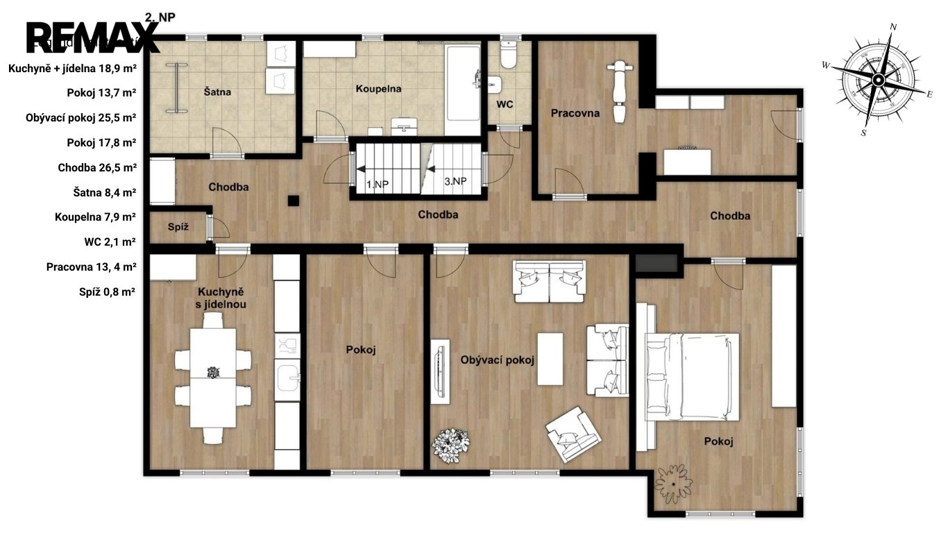 2. nadzemní podlaží: kuchyň s jídelnou, obývací pokoj, dvě ložnice, koupelna, samostatné WC, pracovna, prádelna a úložné prostory.