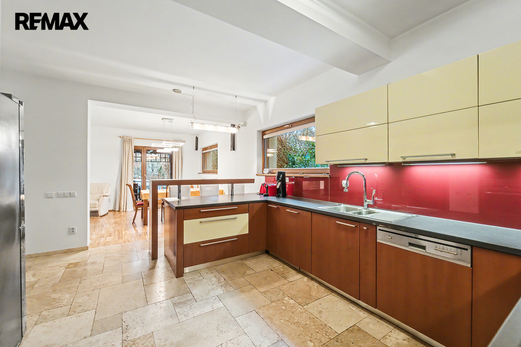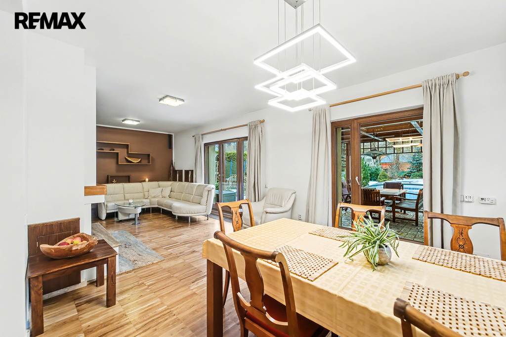 • Dolní podlaží (zahradní): Srdcem domu je velkorysý obývací pokoj s jídelnou a kuchyní, odkud plynule vyjdete na terasu a k bazénu. Najdete zde i pracovnu (ideální pro home office) a zmíněnou saunu.