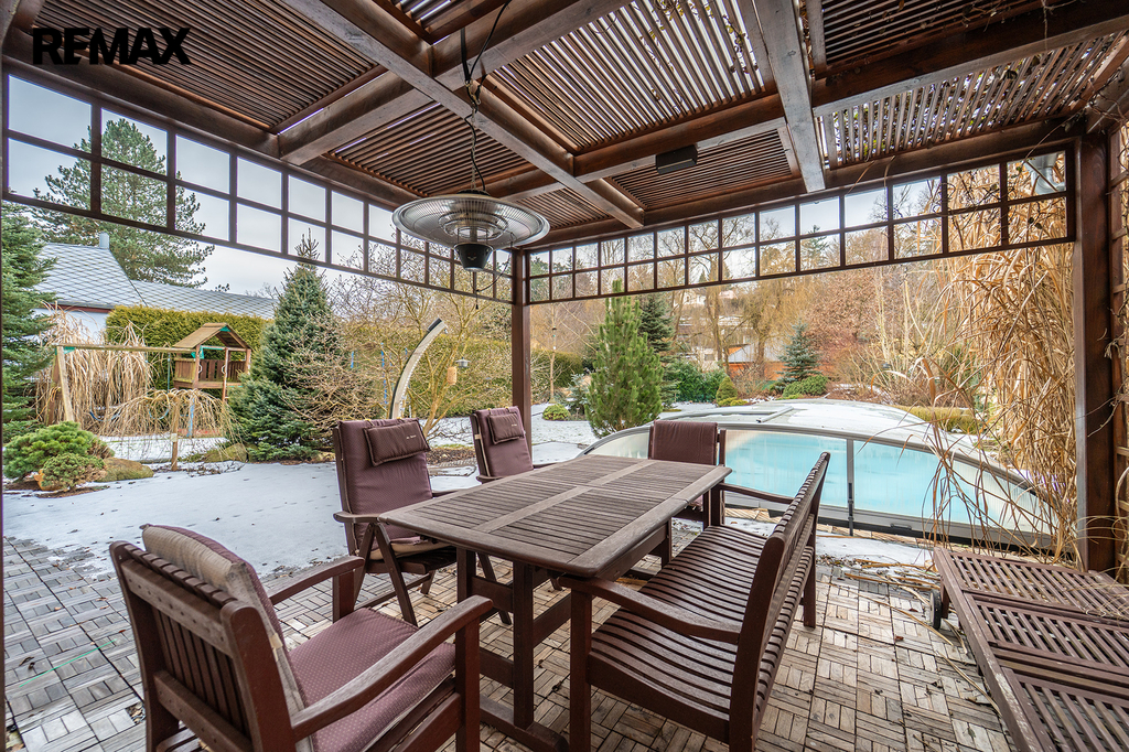 • Koupací sezóna od jara do podzimu: Bazén se slanou vodou a protiproudem je díky zastřešení a tepelnému čerpadlu v provozu od jara do podzimu. Zatímco si děti hrají ve vodě, vy můžete odpočívat vedle bazénu na terase pod pergolou.