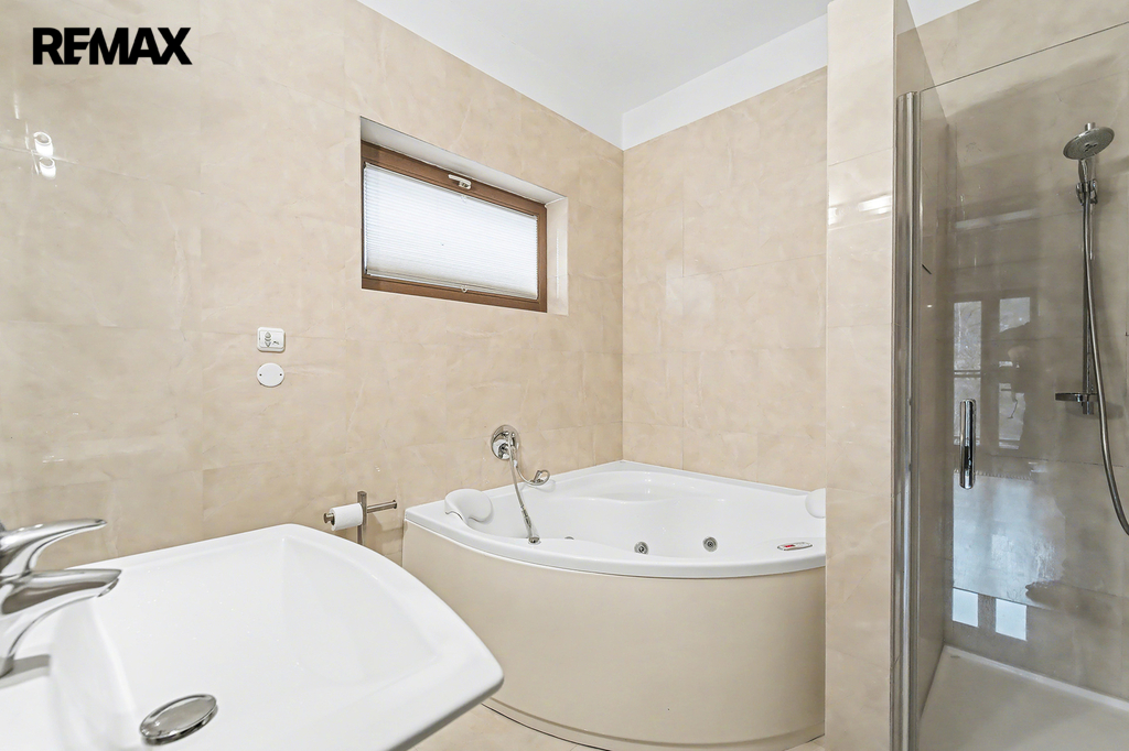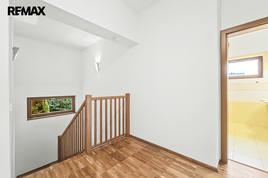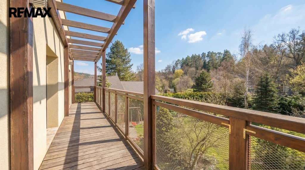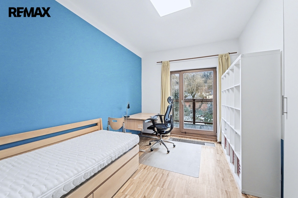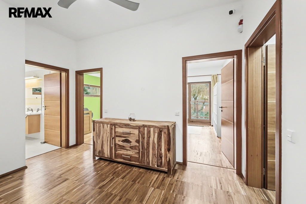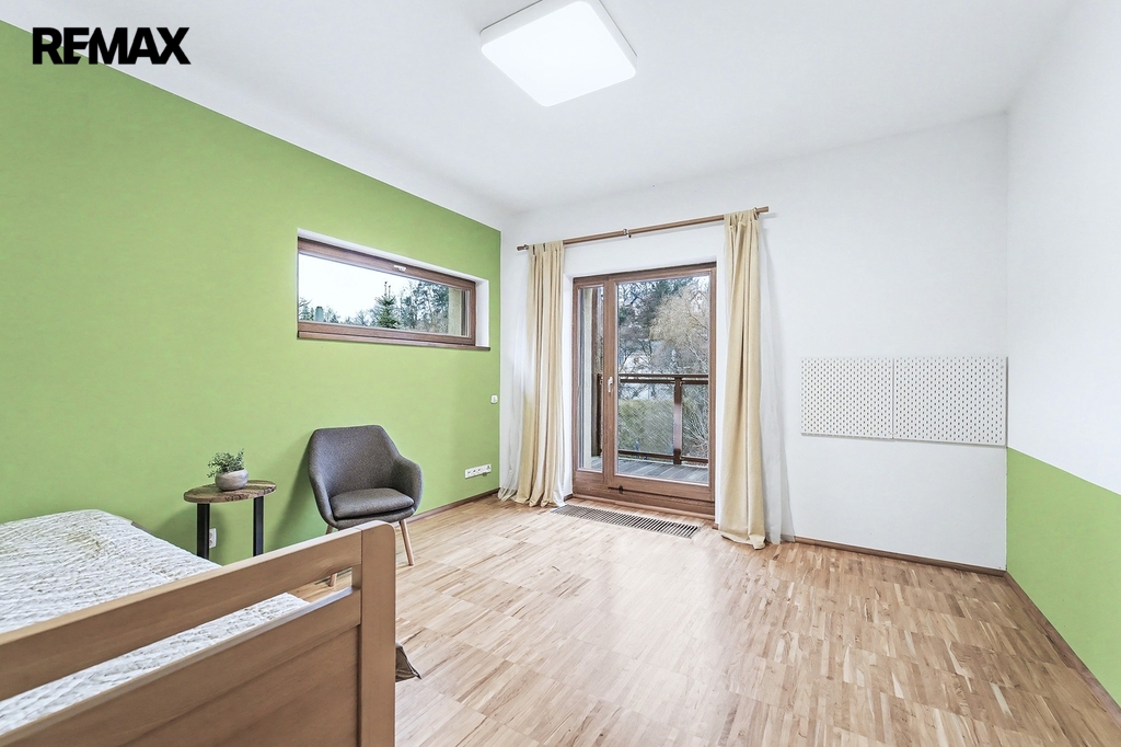 • Horní podlaží (vstupní): Tři prostorné ložnice, z nichž každá má vstup na balkon s výhledem do zahrady. Hlavní ložnice disponuje vlastní koupelnou a šatnou. Dětské pokoje mají vlastní koupelnu – rána bez front v koupelně jsou zaručena.