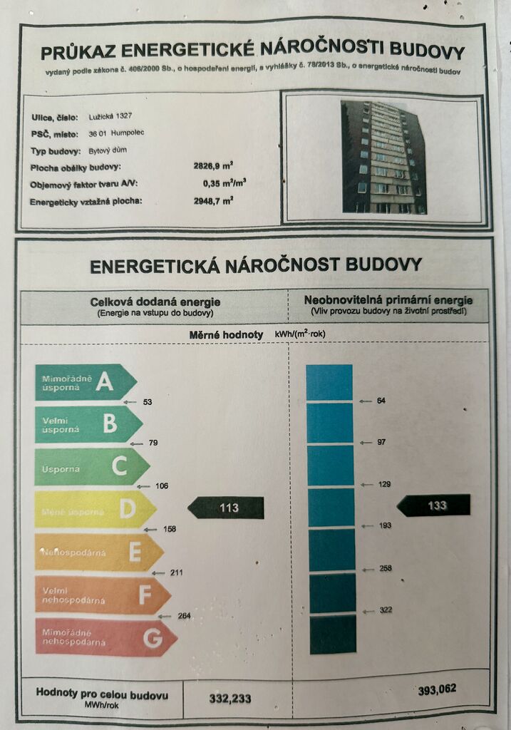 - Energetická náročnost budovy: D - Méně úsporná