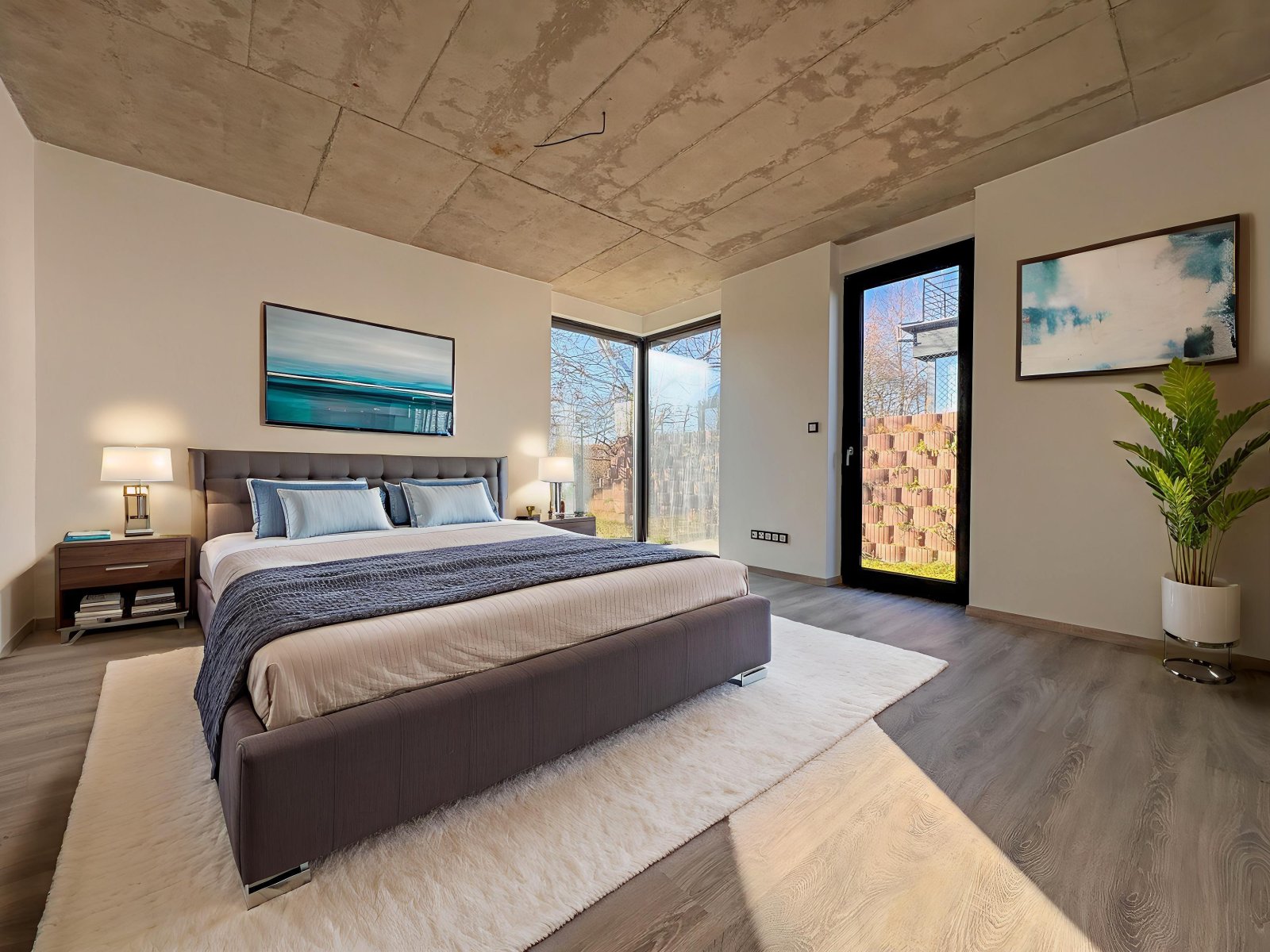 Tahle nemovitost nepůsobí jako běžný pronájem. Je to dům, který má „wow efekt“ už při první návštěvě – díky kombinaci prémiové lokality, promyšlené dispozice, velkorysých teras a výhledů. Každodenní život tady bude o pohodlí: zaparkujete v garáži, přijdete domů suchou nohou, otevřený obytný prostor vás vtáhne světlem a večer můžete trávit čas na terase nebo u krbu v obývacím pokoji.
