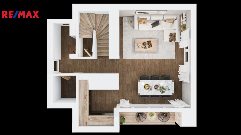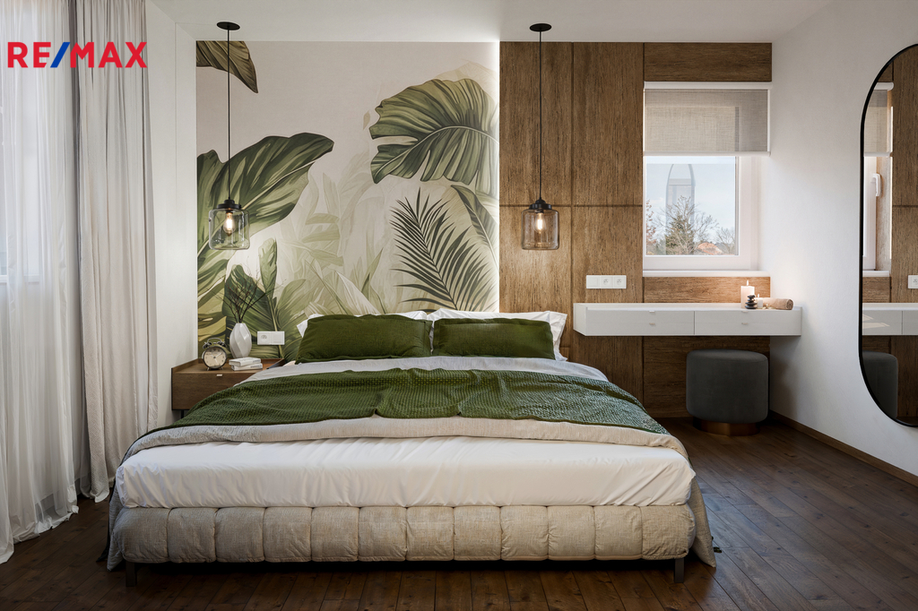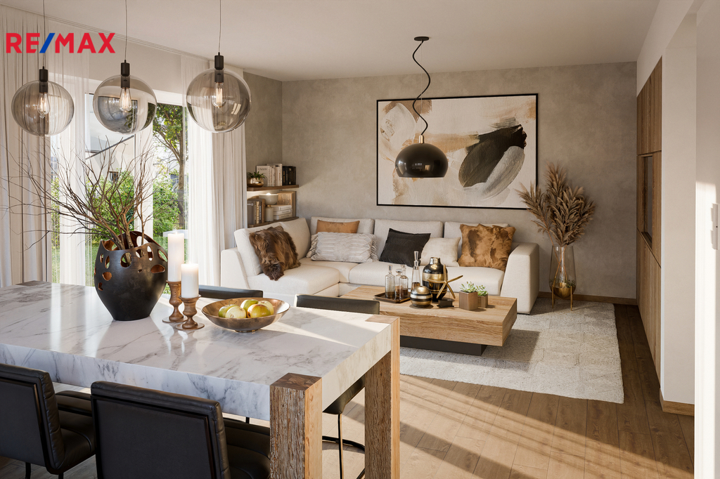 Interiér je možné dokončit na klíč podle výběru klienta. Developer nabízí širokou škálu kvalitních podlahových krytin, velkoformátové dlažby i moderní interiérové dveře. Elegantní dubové schodiště propojuje obě patra. V ceně je zahrnuta i moderní kuchyňský linka bez spotřebičů i kompletně vybavená koupelna s designovým podsvíceným zrcadlem.
