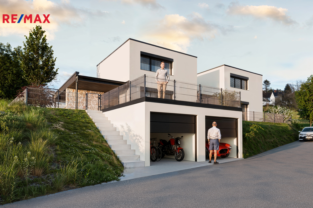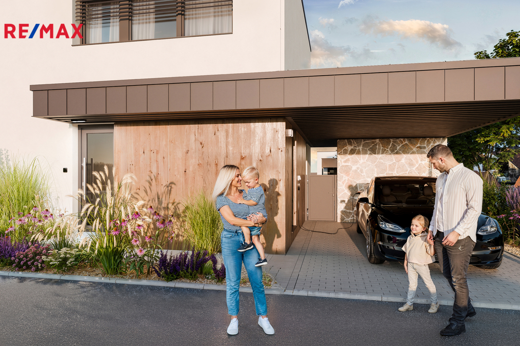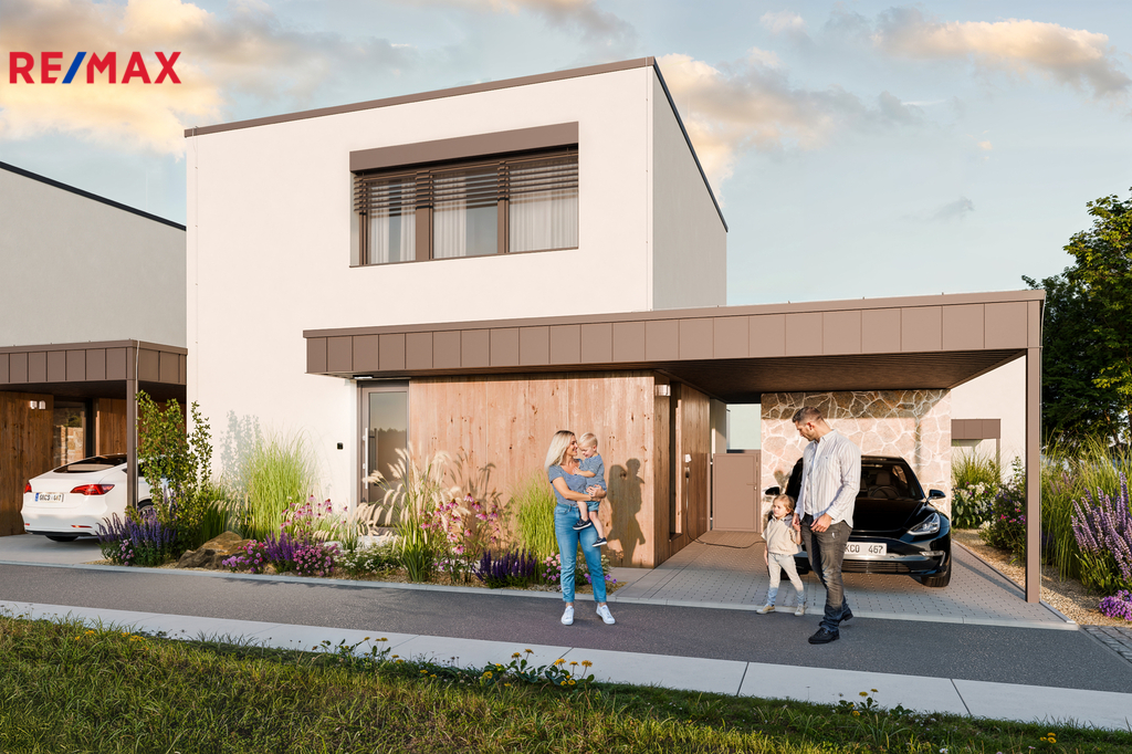 Součástí ceny je dokončený exteriér. Pozemek je oplocen svařovaným antracitovým plotem. Přední část pozemku je upravena zelení a doplněna o venkovní osvětlení se soumrakovým čidlem. Kryté parkovací stání je připraveno pro instalaci nabíjecího zařízení pro elektromobil.