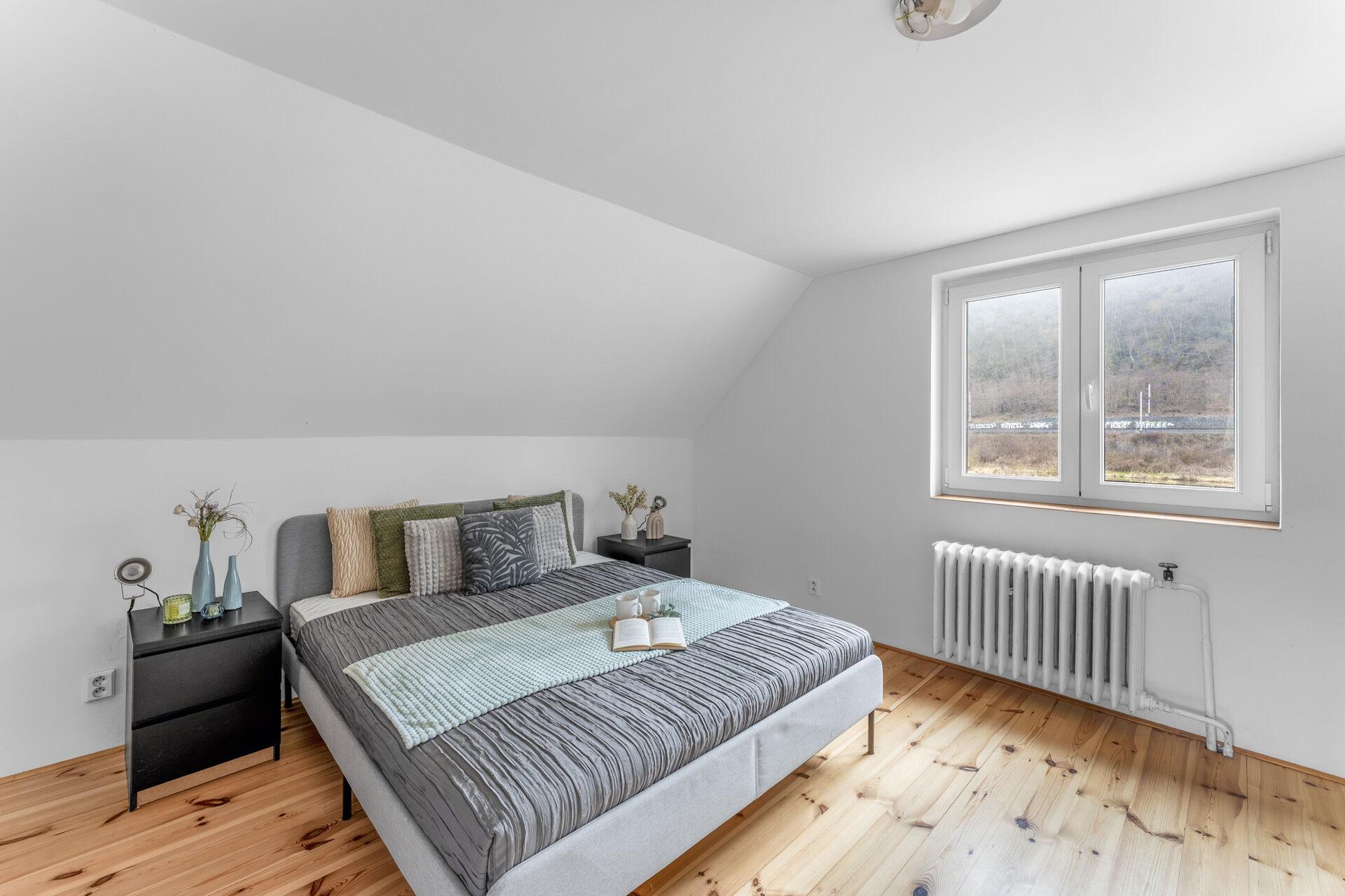 V prvním nadzemním podlaží se nachází hlavní místnost domu, obývací pokoj orientovaný do zahrady s výhledem na Vltavu, dále samostatná kuchyně, která je po rekonstrukci, je z ní přímý vstup na terasu a je plně vybavená, nechybí sporák, myčka, lednice s mrazákem či digestoř. Na patře dále najdete předsíň a koupelnu, která disponuje vanou, sprchou a toaletou. Druhé podlaží se skládá z prostorné chodby, samostatného WC, menší místnosti v podkroví, která v minulosti sloužila jako dětský pokoj, nyní je spíše vhodná jako úložný prostor a v neposlední řadě velké ložnice.