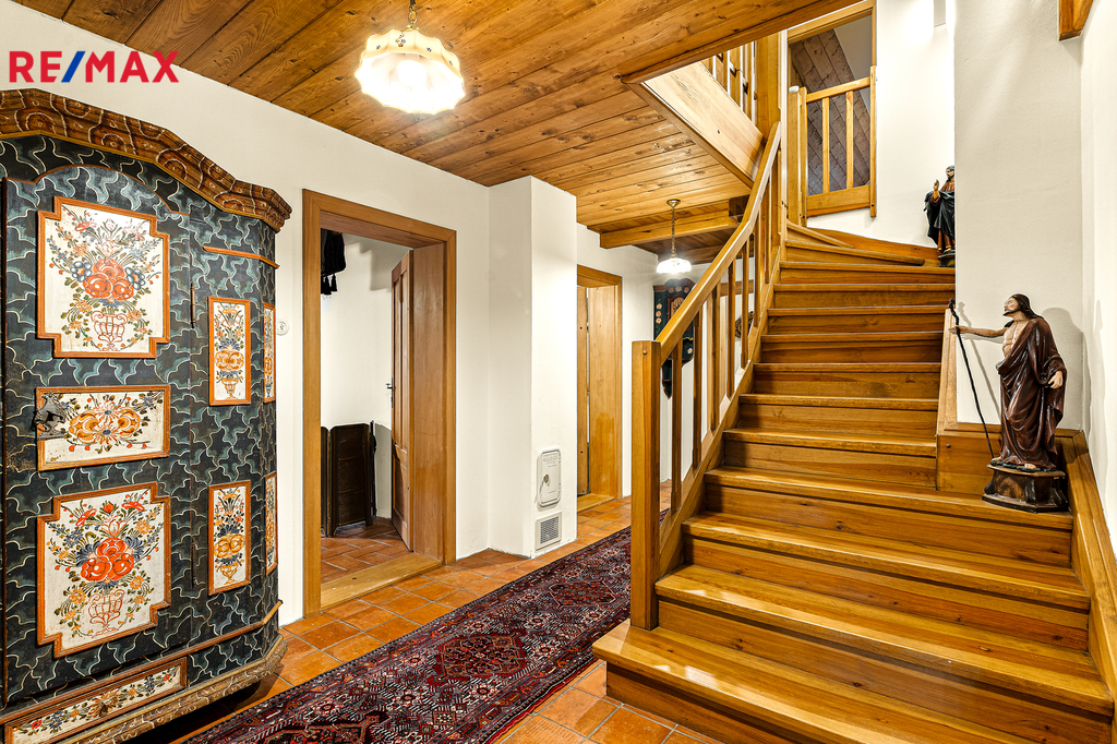 Dominantou hlavní chodby chalupy je masivní dubové schodiště, v patře nad hlavní částí chalupy se nacházejí tři samostatné ložnice s vlastní koupenou. Dispozice chalupy tímto zajišťuje dostatek soukromí pro vícečlennou rodinu nebo početnější návštěvu. V interiéru naleznete řadu originálních i rekonstruovaných prvků tradičního krkonošského nábytku, které dodávají chalupě jedinečný charakter. Chalupa byla rekonstruovaná v roce 2006, s důrazem na kvalitu použitých materiálů a dlouhodobou životnost. Měděné rozvody podlahového vytápění Rehau, speciální střešní krytina Capacco, designové vypínače a zásuvky Berker, dveřní kování ruční výroby. O vytápění se starají dvě tepelná čerpadla Stiebel Eltron, nechybí ani kotel na dřevo či možnost využít plyn (2t zásobník propan-butan). V chalupě jsou dvě rekuperace, dvě klimatizace Haier, bezpečností kamerový systém, stabilní a vysokorychlostní DSL internet. Součástí komfortního vybavení je chytrý systém vytápění s možností dálkového ovládání přes internet.