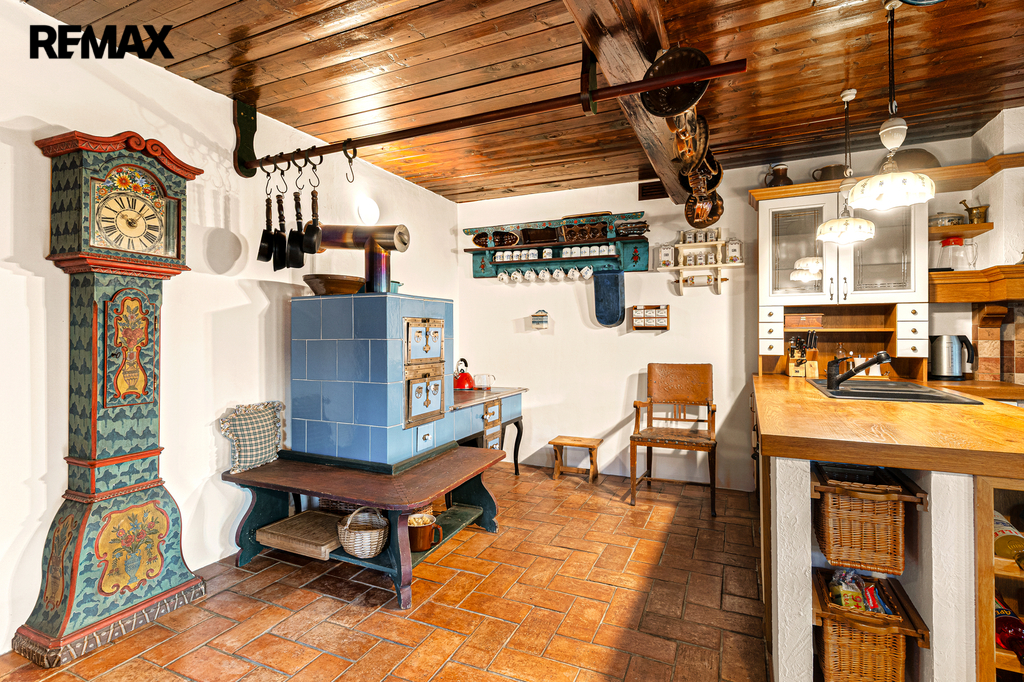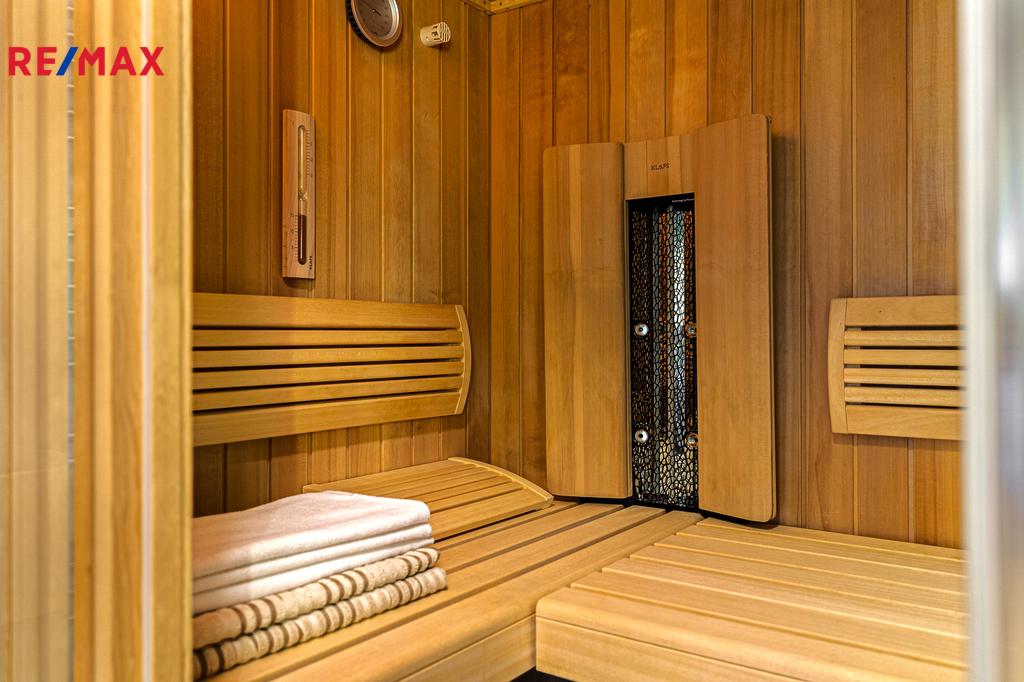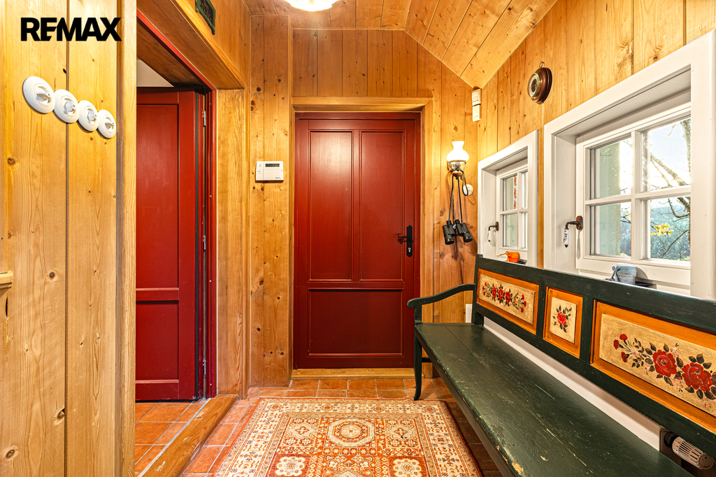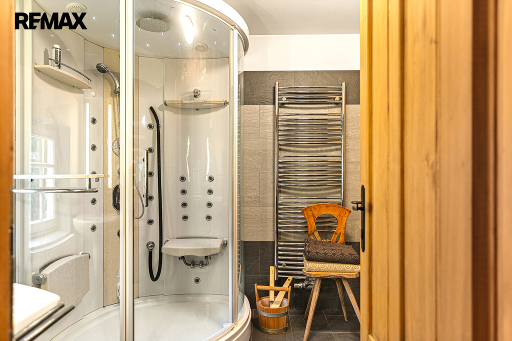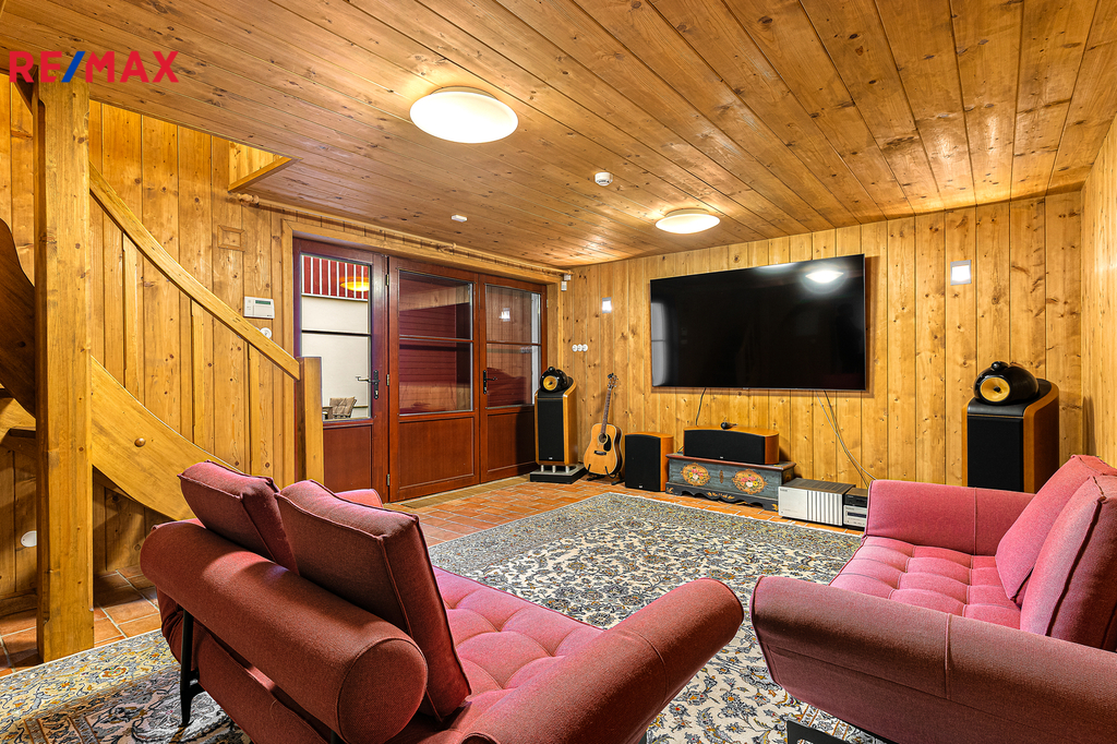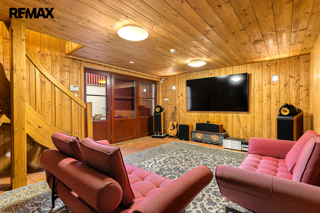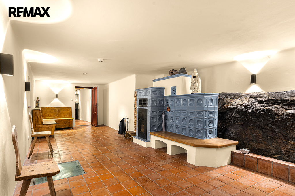 V přízemí se nachází prostorná, do detailu vybavená obytná kuchyně s jídelnou, ideální pro velké rodinné setkání či přátelské posezení. Atmosféru dotváří krásná kachlová kamna a stylová replika místních stojacích hodin s původním strojkem. Součástí přízemí je i odpočinková místnost, využitelná i jako ložnice s vlastní koupelnou vybavenou špičkovou saunou KLAFS (finská sauna, saunarium, infrasauna) a parní sprchou KERAMAG AURA. Samozřejmostí je i samostatné WC. V zadní části domu se nachází moderní kotelna a původní kamenný sklep se stálou teplotou. Dispozici přízemí dále tvoří místnost s výjimečným atraktivním prvkem - přiznanou skalní stěnou, po níž jemně stékají pramínky vody. Další místnost, která je vybavená barem a elektrickým krbem zn. ELEMENT, tvoří společenskou část chalupy a navazuje na ní kinosál vybavený technikou B&W. Z této místnosti je vstup na spodní venkovní terasu. Nad tímto křídlem se nacházejí dvě ložnice s vlastní koupelnou a jedna je se vstupem na druhou vyvýšenou venkovní terasu, která je vybavená stylovým nábytkem EcoFurn, Solo Stove.