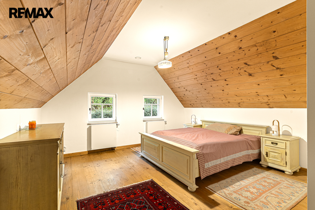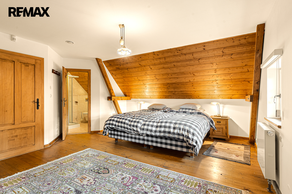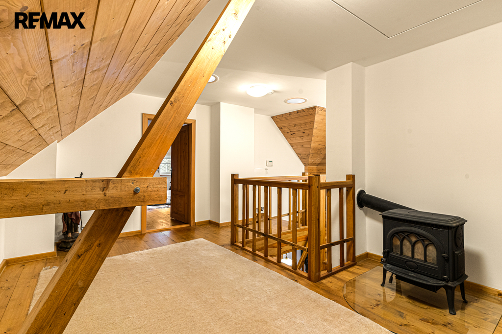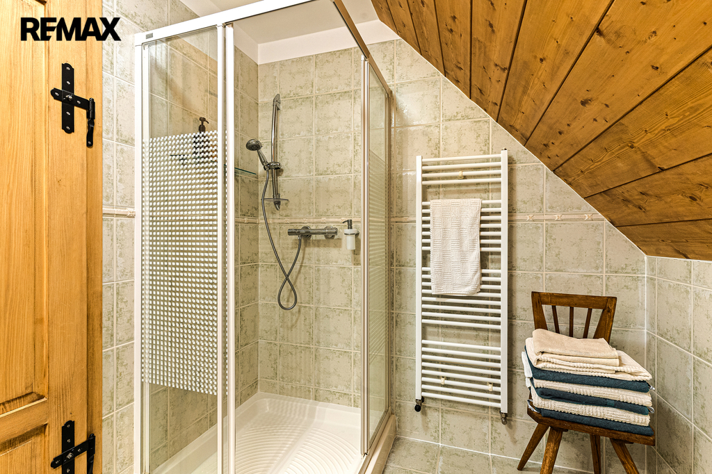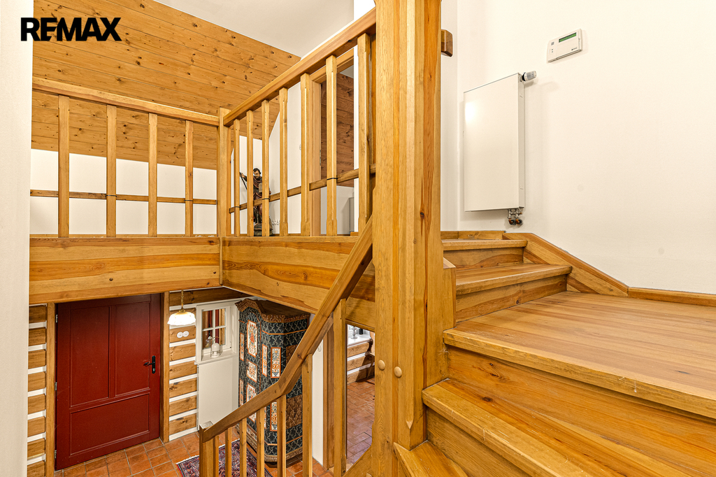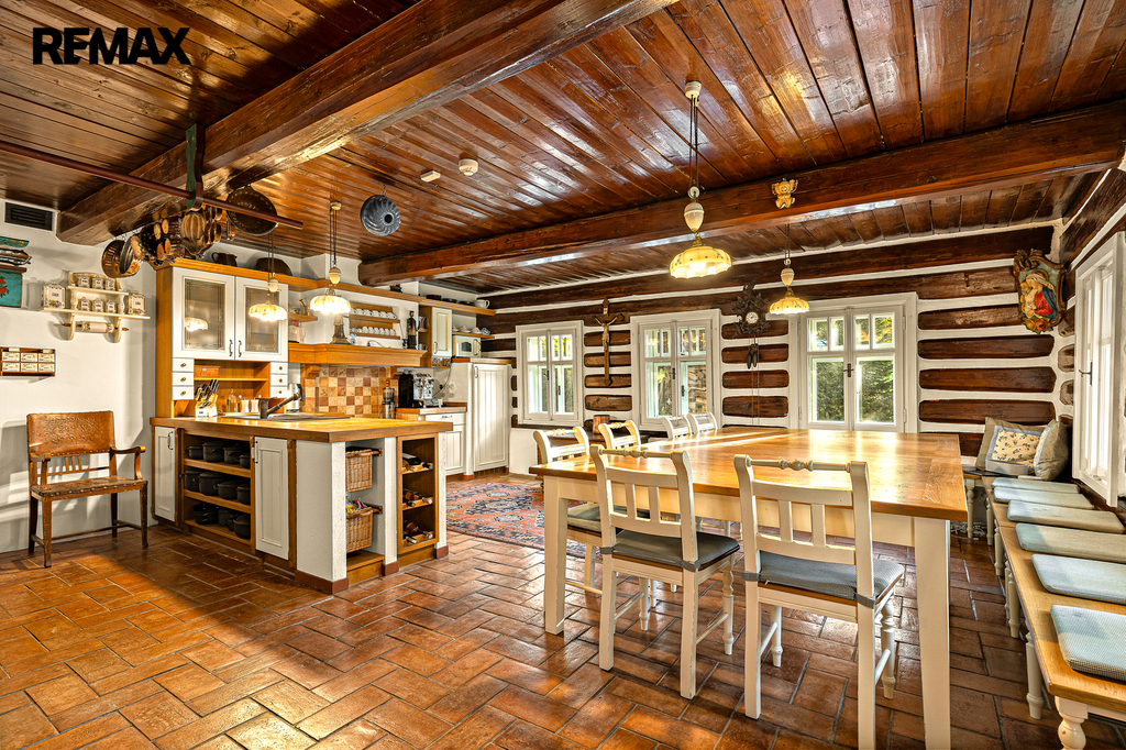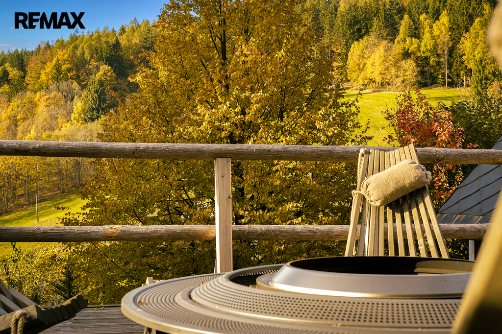 V přízemí se nachází prostorná, do detailu vybavená obytná kuchyně s jídelnou, ideální pro velké rodinné setkání či přátelské posezení. Atmosféru dotváří krásná kachlová kamna a stylová replika místních stojacích hodin s původním strojkem. Součástí přízemí je i odpočinková místnost, využitelná i jako ložnice s vlastní koupelnou vybavenou špičkovou saunou KLAFS (finská sauna, saunarium, infrasauna) a parní sprchou KERAMAG AURA. Samozřejmostí je i samostatné WC. V zadní části domu se nachází moderní kotelna a původní kamenný sklep se stálou teplotou. Dispozici přízemí dále tvoří místnost s výjimečným atraktivním prvkem - přiznanou skalní stěnou, po níž jemně stékají pramínky vody. Další místnost, která je vybavená barem a elektrickým krbem zn. ELEMENT, tvoří společenskou část chalupy a navazuje na ní kinosál vybavený technikou B&W. Z této místnosti je vstup na spodní venkovní terasu. Nad tímto křídlem se nacházejí dvě ložnice s vlastní koupelnou a jedna je se vstupem na druhou vyvýšenou venkovní terasu, která je vybavená stylovým nábytkem EcoFurn, Solo Stove.