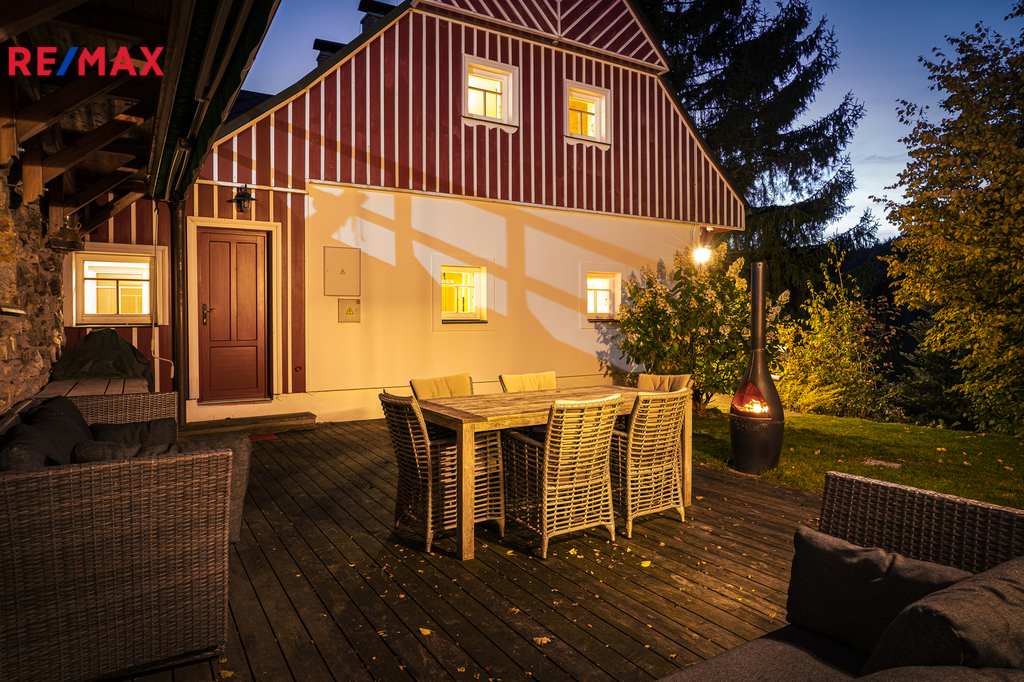 U domu se nacházejí tři venkovní terasy, hlavní je s venkovním krbem, v patře je terasa s ohništěm a třetí relaxační terasa je s venkovní vířivkou HotSpring. Součástí je garáž a soukromé parkování pro 4 vozy. Chalupu obklopuje rozsáhlý pozemek o velikosti 27.504m2, jedná se o jedno z nejzachovalejších krkonošských údolí, kde naleznete pouze původní chalupy a minimální provoz. Nemovitost stojí v klidné neprůjezdné části obce Horní Dušnice obklopená lesy, loukami a protékajícím potůčkem. Nejbližší lyžařské středisko je Horní Rokytnice, kde se nově buduje nová šestisedačková lanovka.