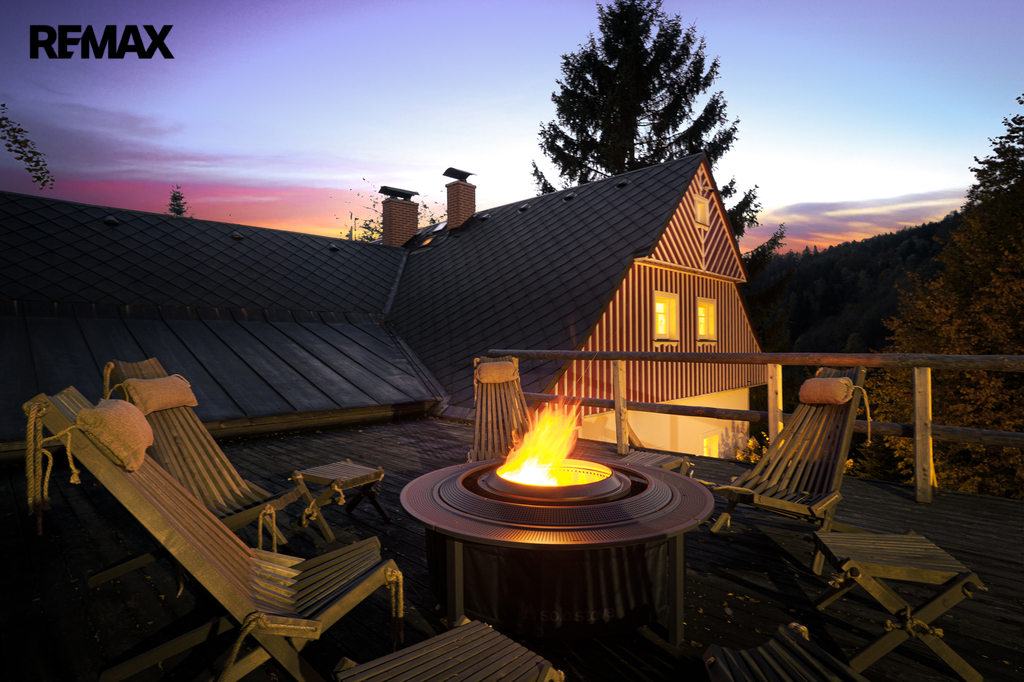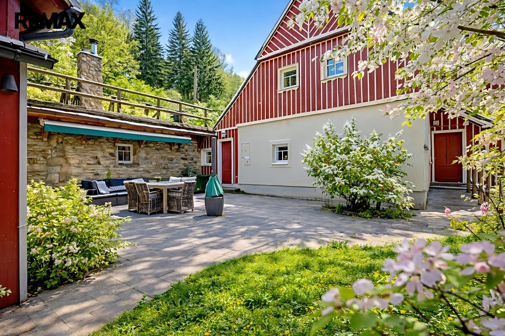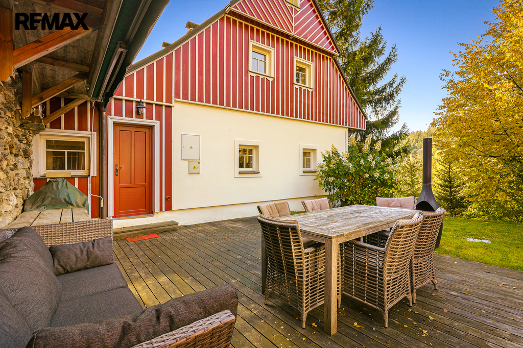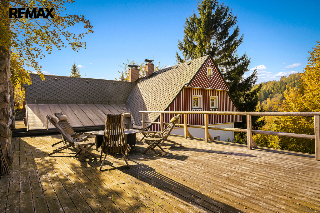 U domu se nacházejí tři venkovní terasy, hlavní je s venkovním krbem, v patře je terasa s ohništěm a třetí relaxační terasa s vířivkou HotSpring. Součástí je garáž pro 4 vozy. Chalupu obklopuje pozemek o velikosti 27.504m2, jedná se o jedno z nejzachovalejších krkonošských údolí, kde naleznete pouze původní chalupy a klid. Nemovitost stojí v klidné neprůjezdné části obce Horní Dušnice obklopená lesy a loukami. Nejbližší lyžařské středisko je Horní Rokytnice, kde se nově buduje nový špičkový lyžařský areál, přes kopec s Prodávající si vyhrazuje právo vybrat kupujícího na základě jím zvolených kritérií.