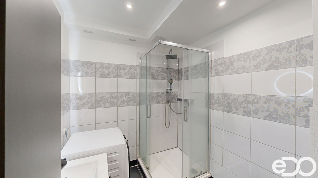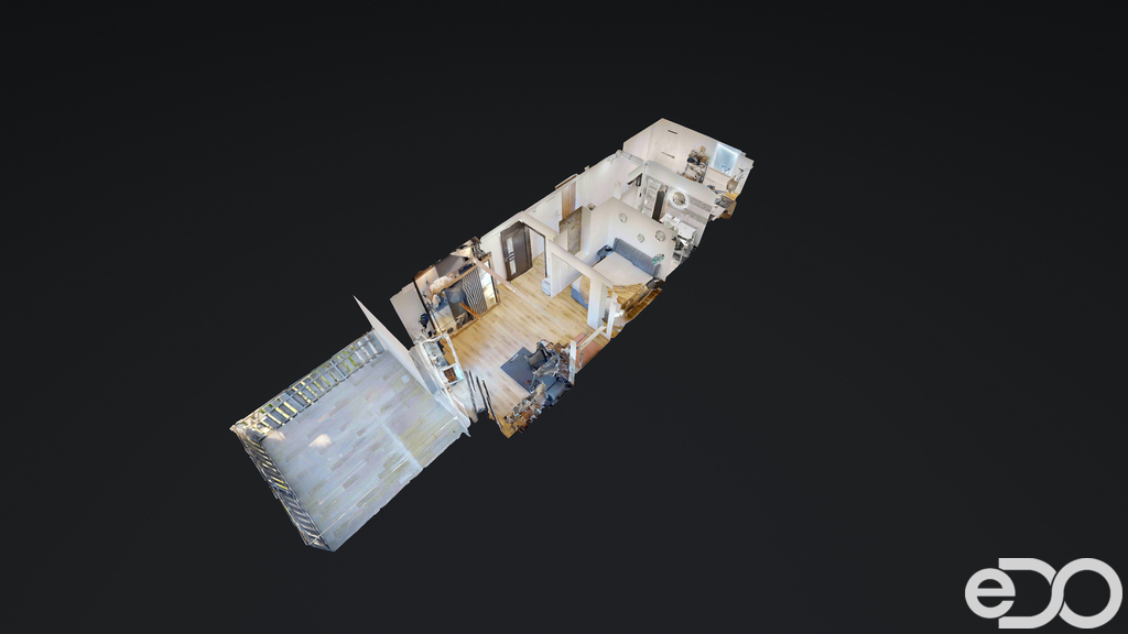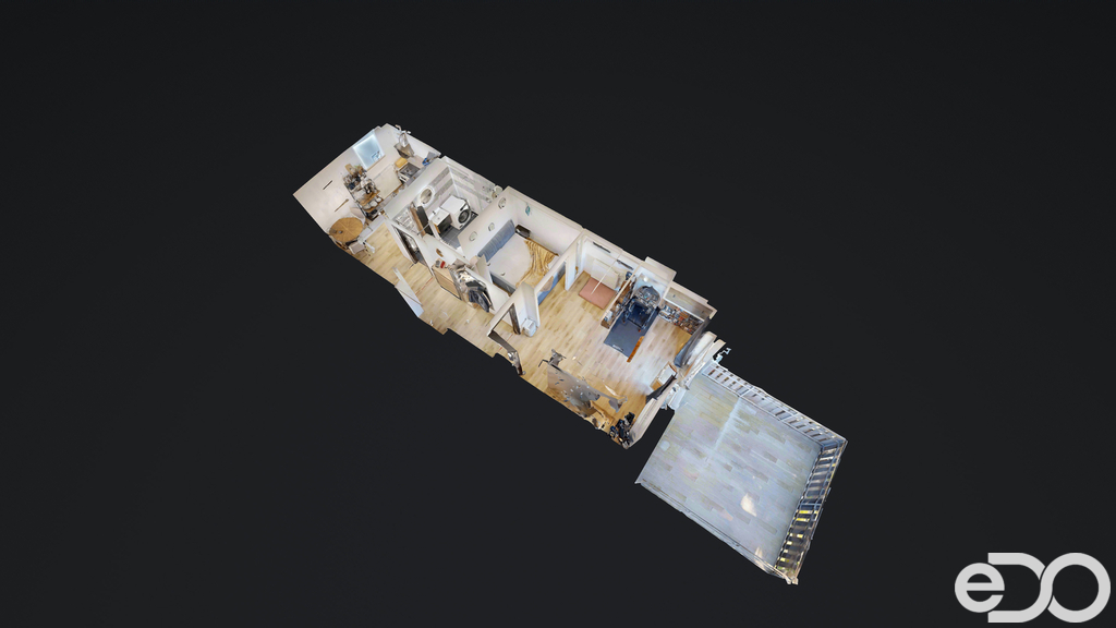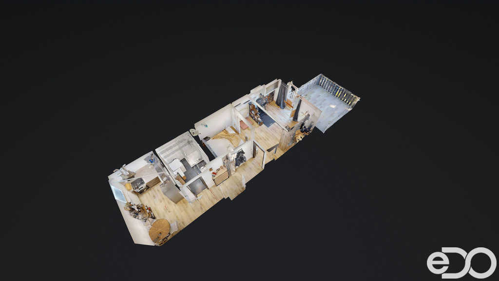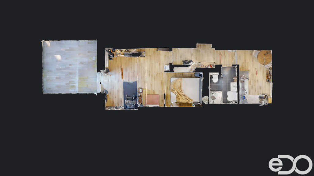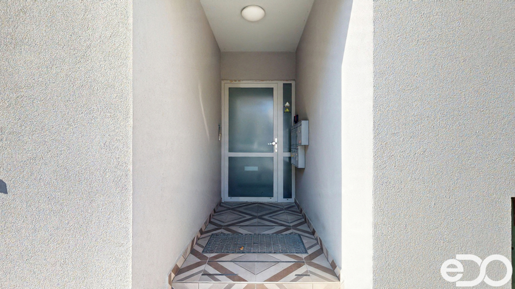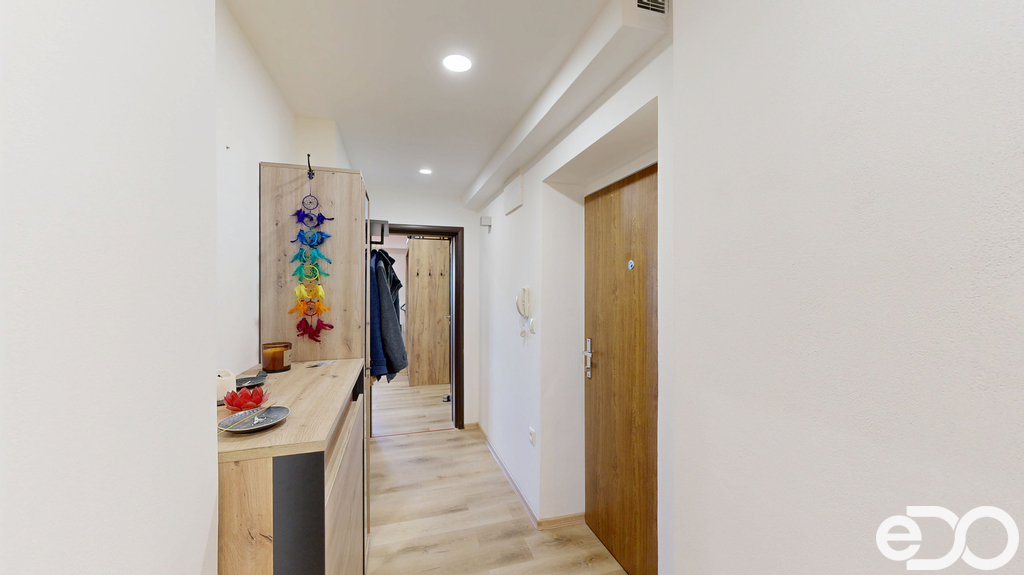 Při vstupu se dostanete do chodby. Do leva se jde do místnosti s kuchyňským koutem a dále tu jsou dveře do koupelny, vpravo od vstupu dojdete do velké napůl přepažené místnosti ( takže byt evokuje spíše rozdělení 3+kk ) z které je vstup na velkou terasu.