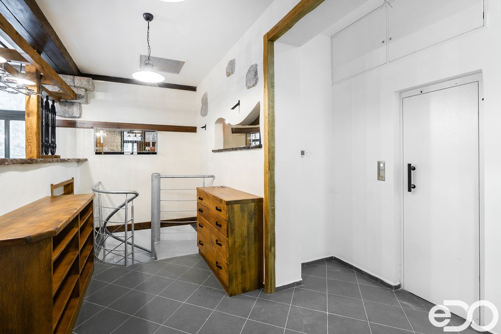 V podkroví: byt správce 2+kk, služební místnosti, posilovna 56 m²