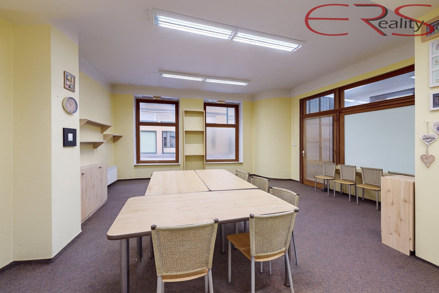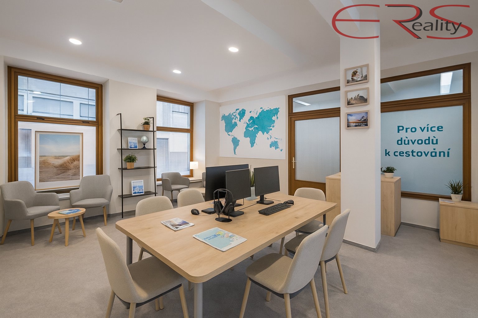hlavní místnost o ploše cca 33,7 m² s výlohami do ulice, navazující zázemí cca 8,3 m² (samostatná místnost s kuchyňským koutem pro zázemí personálu). Praktické uspořádání, vysoké stropy a dostatek denního světla.