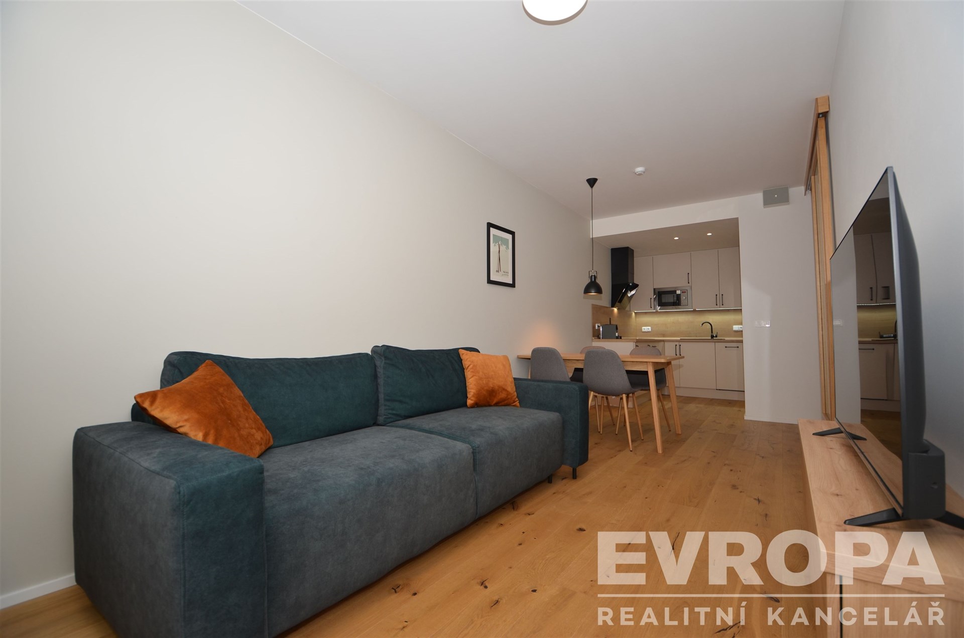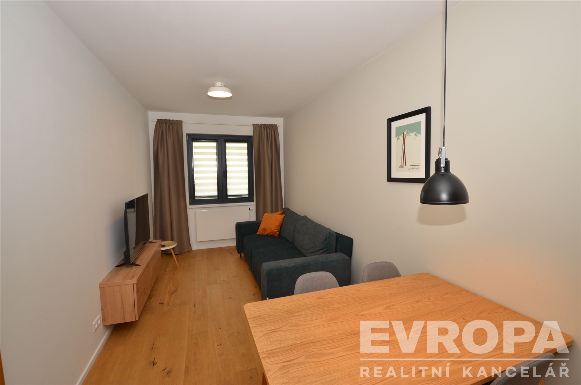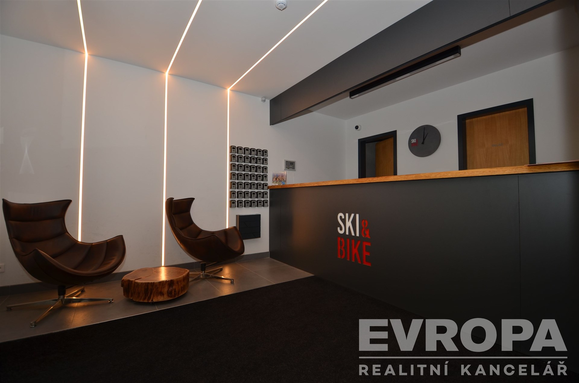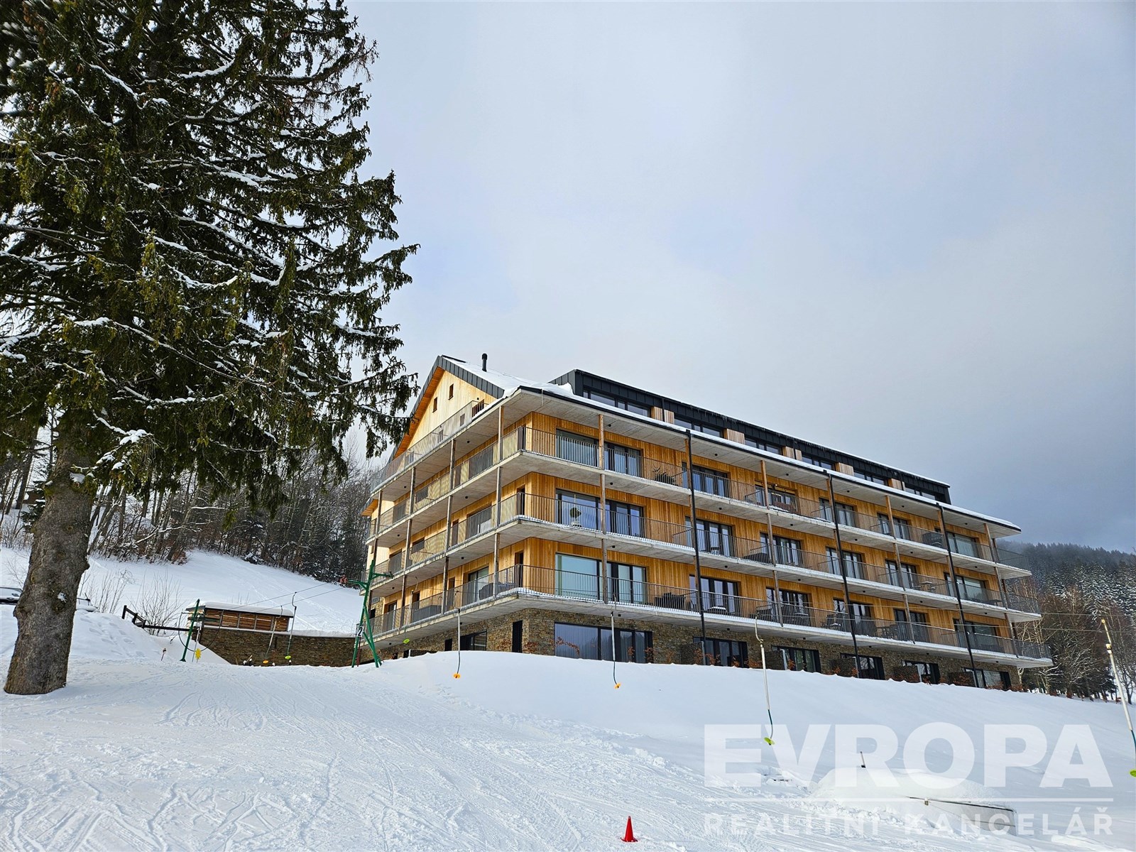 Dispozice apartmánu 2+kk s celkovou výměrou 47,6m2, je umístěn v přízemí 1.NP. Skládá se z předsíně s úložnými vestavěnými skříněmi, obývacího pokoje s jídelním a kuchyňským koutem, kuchyňská linka se spotřebiči. Apartmán se nabízí na prodej včetně kompletního vybavení a zařízení viz. fotografie. Obrovskou výhodou je vlastní venkovní parkovací stání, sklep s přívodem elektřiny pro nabíjení elektrokol a vlastní skibox.
