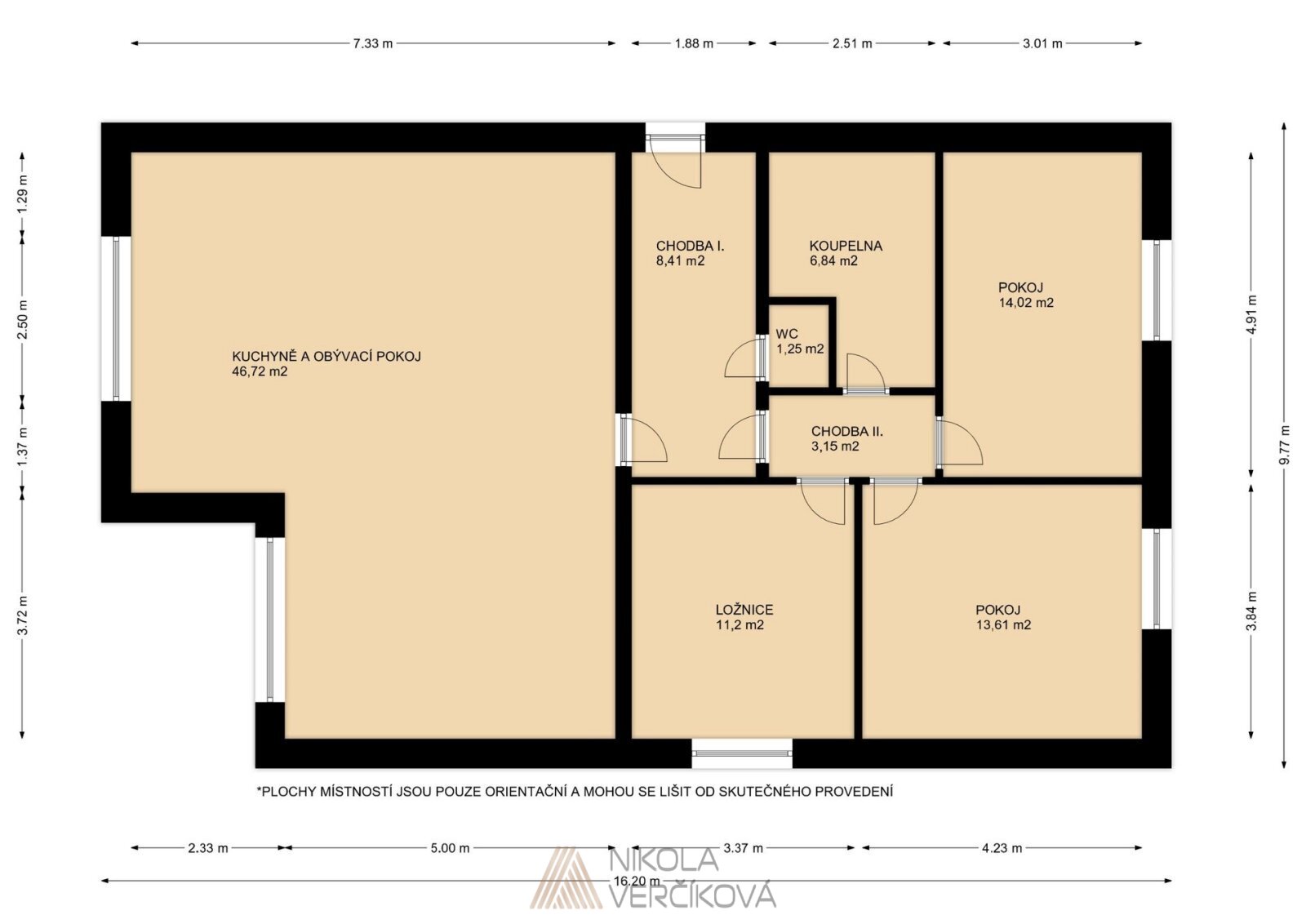 Interiér nabízí tři samostatné obytné pokoje (14,0m2, 13,6m2, a 11,2m2) prostorný obývací prostor propojený s kuchyní a jídelnou (46,7m2), samostatné WC(1,2m2) a koupelnu se sprchovým koutem a druhým WC (6,8m2). Z obývací i jídelní části vede vstup přímo na rozlehlou terasu, která láká k ranní kávě, večernímu posezení i rodinným oslavám pod širým nebem.