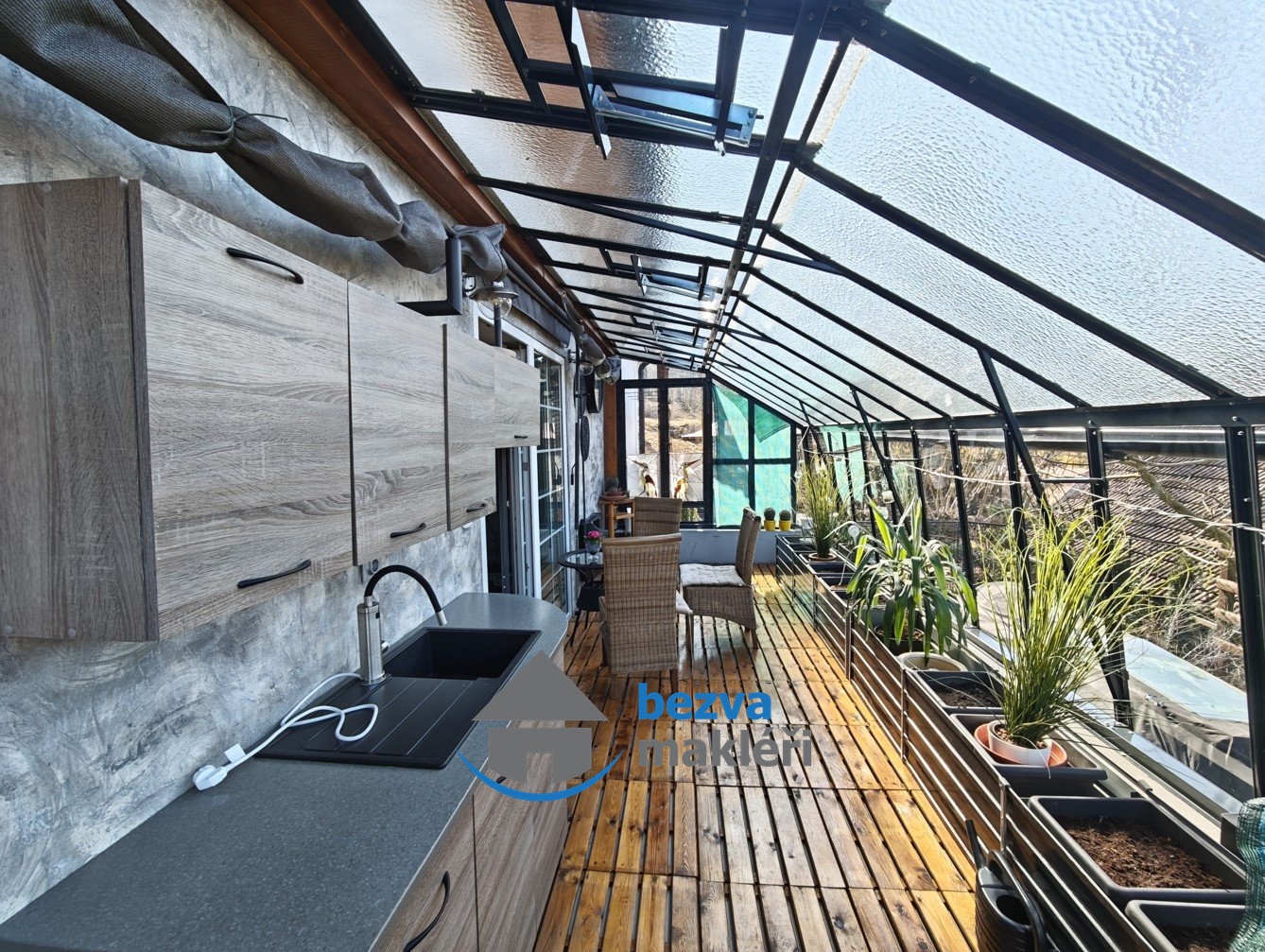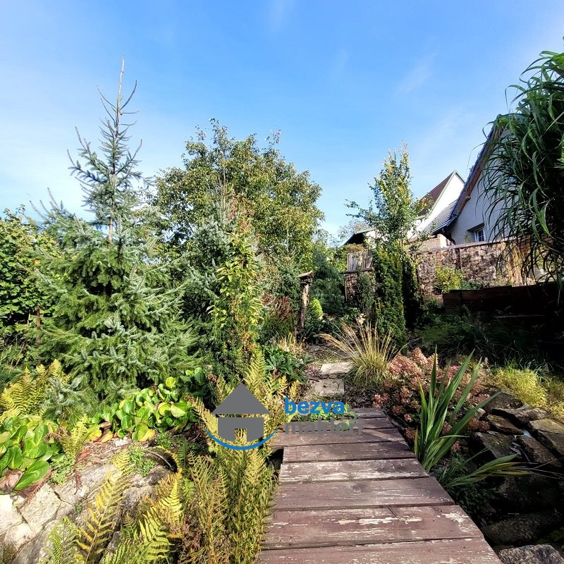 Prosluněná zahrada je koncipována spíše jako okrasná, nicméně je zde i několik ovocných stromů a vyvýšené záhony. Pod verandou a terasou je úložný prostor pro zahradní techniku, nářadí a náčiní. Zhotovení zábradlí a schodů na terasu bude již v režii nového majitele. K dispozici zůstává dřevo na jednu topnou sezónu.