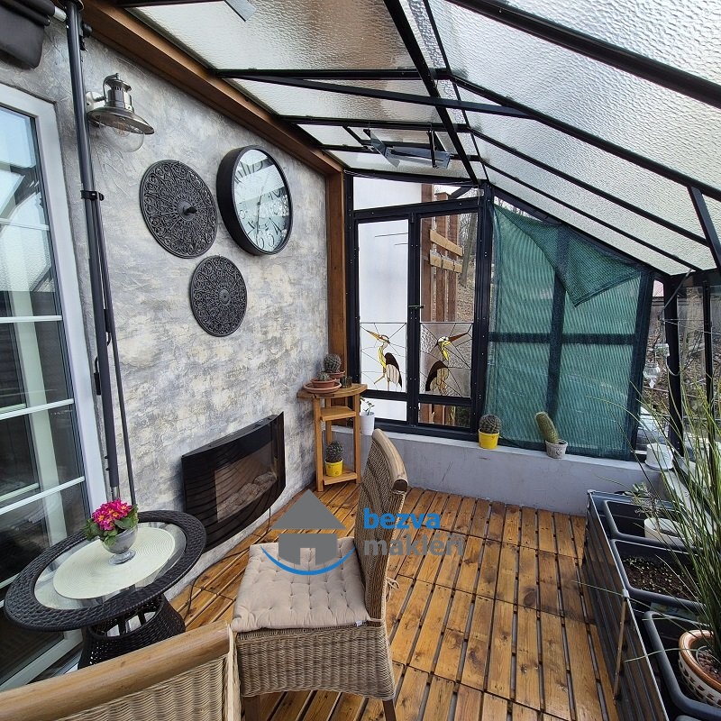 V obývacím pokoji se nachází vysoce výhřevná krbová kamna, která spolu s kamny v kuchyni celý obytný prostor bez problémů vytopí. Můžete z něj vstoupit do dalšího pokoje a také do prosklené verandy, kde je příjemné posedět v každé roční době. Za slunných dnů v zimních měsících teplo z verandy ohřívá obývací pokoj a ve dnech s nedostatkem slunečních paprsků zde lze přitápět elektrickým krbem.