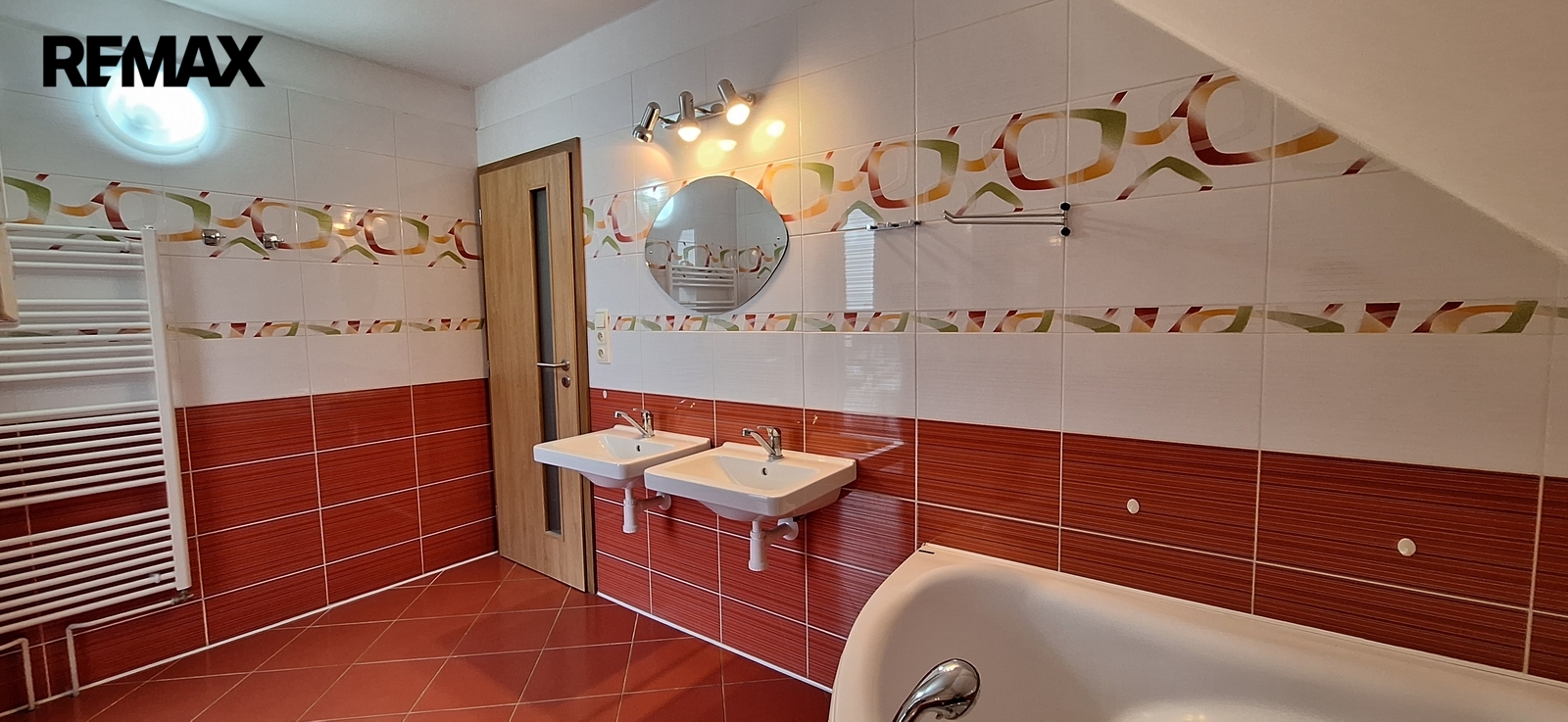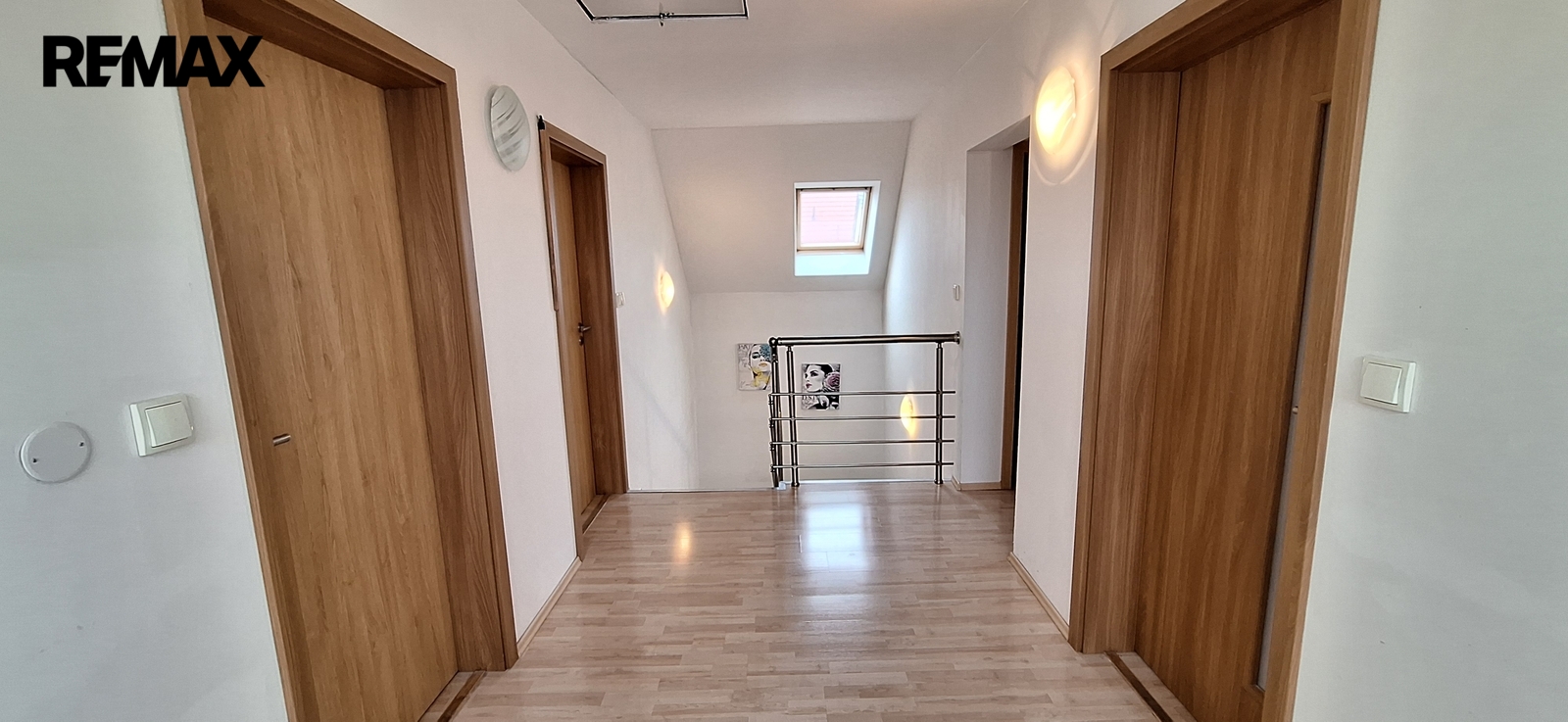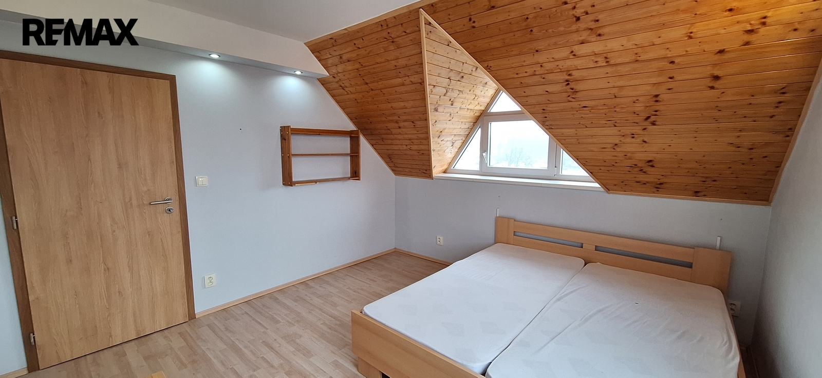 - 1. patro: pokoj (15 m2); pokoj (14 m2); ložnice (15 m2); chodba (10 m2); šatna s pračkou a skříněmi (4 m2); koupelna s WC a dvěma umyvadly (8 m2); z chodby je vstup ve stropě na půdu po žebříku.