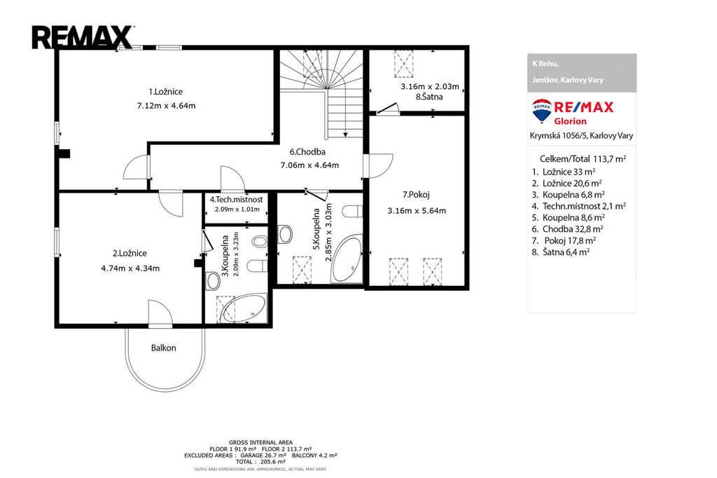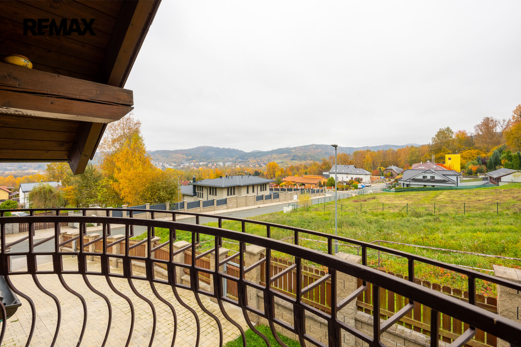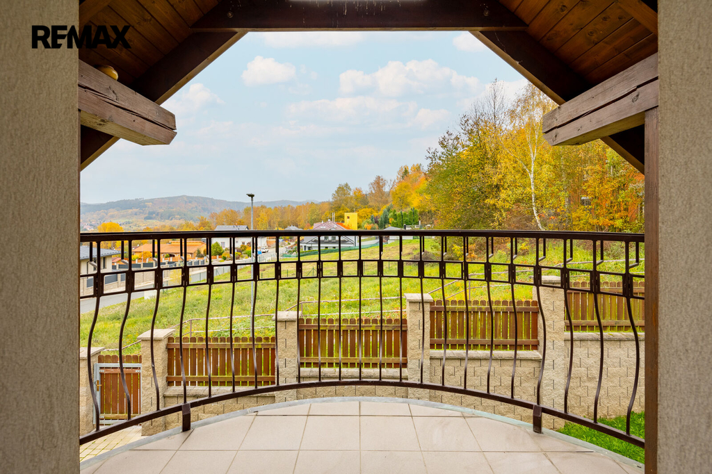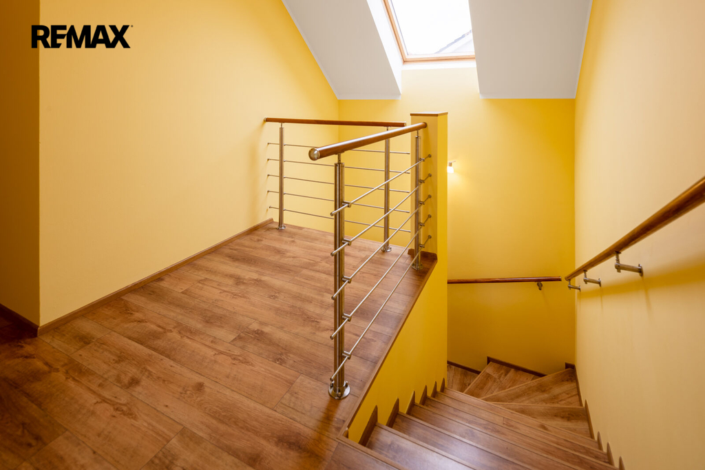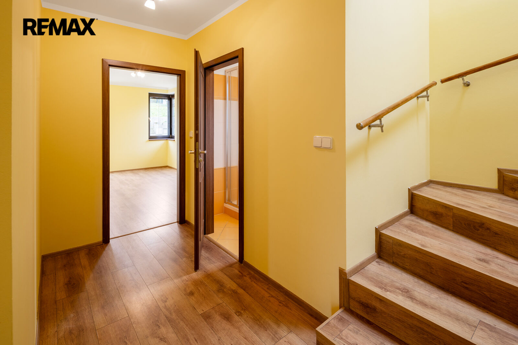 V prvním patře jsou tři další pokoje. Hlavní ložnice disponuje vlastní koupelnou a balkónem, který nabízí nádherný výhled na okolní krajinu. Pro pohodlí celé rodiny je zde navíc druhá koupelna.