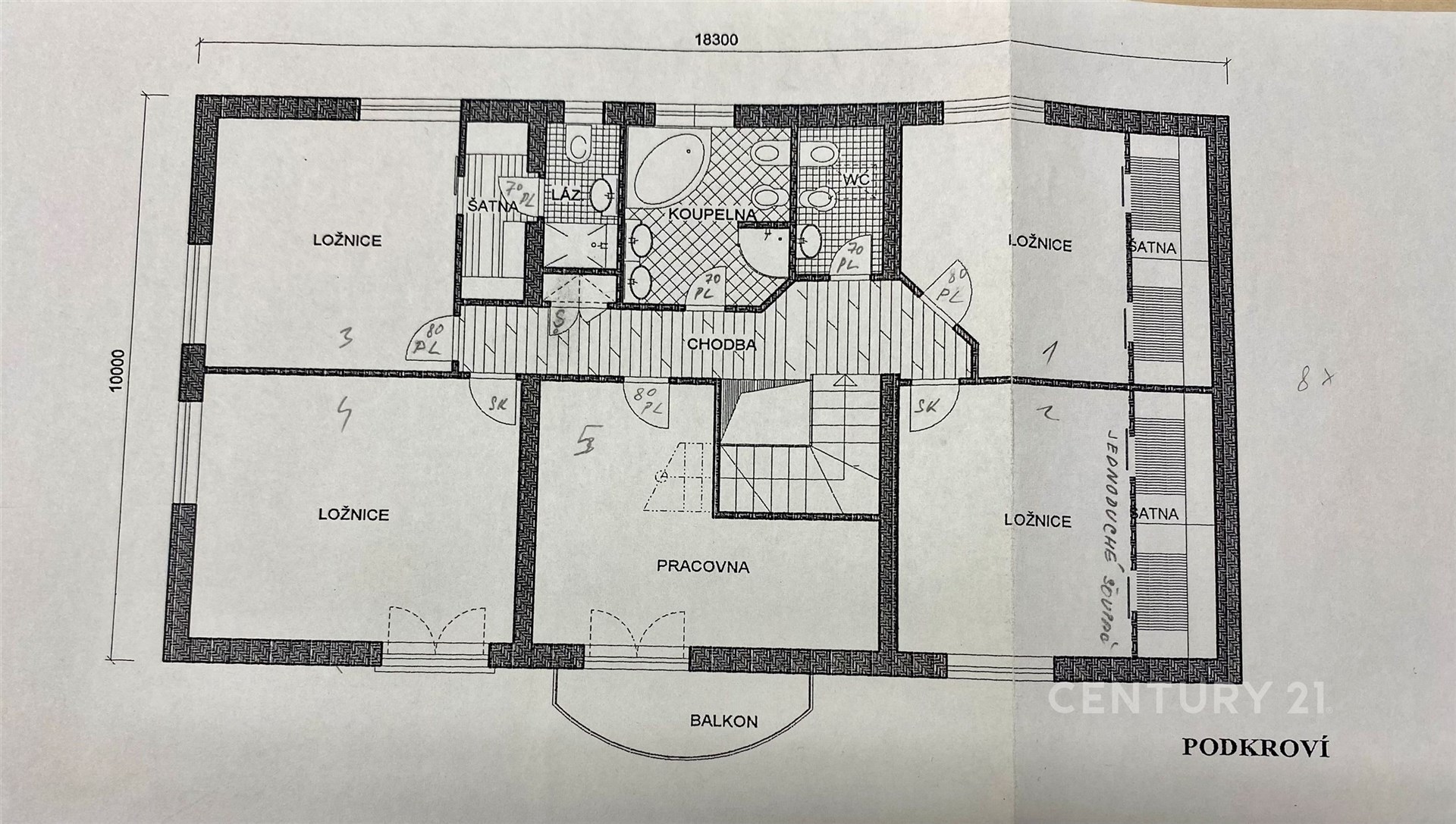 V patře se nachází 5 ložnic se šatnami, 2 koupelny, 1 samostatné WC s bidetem.