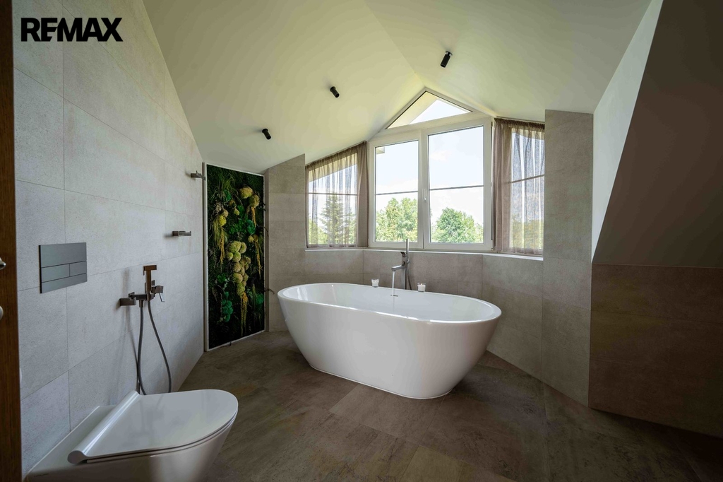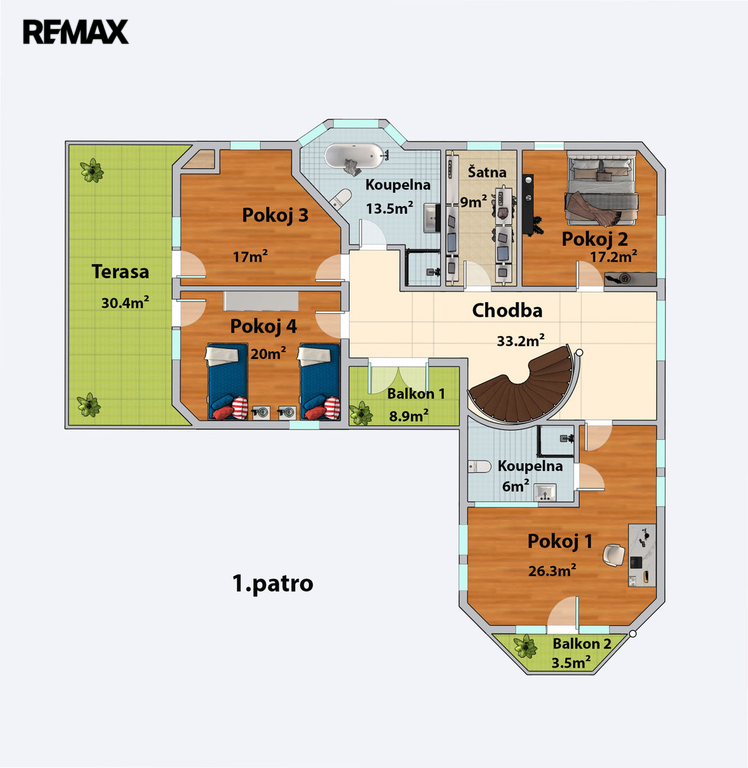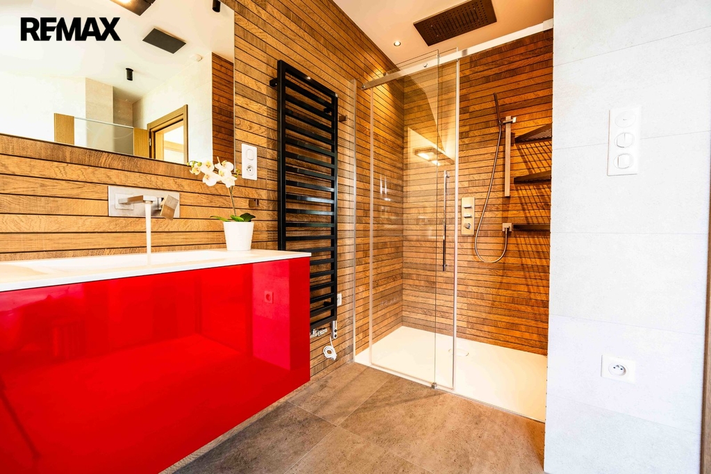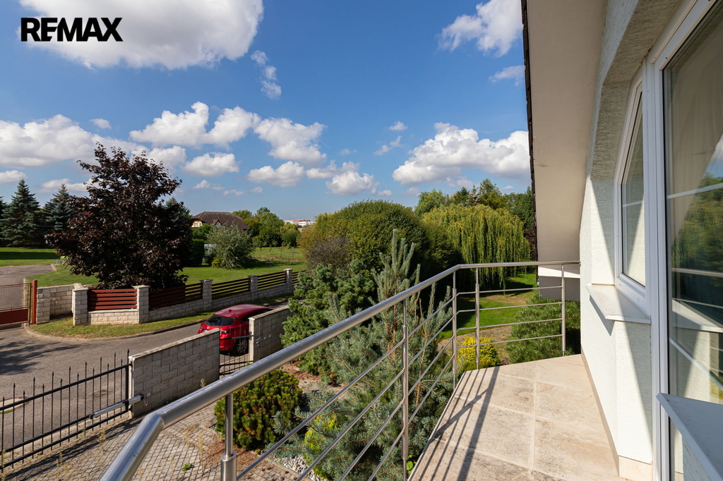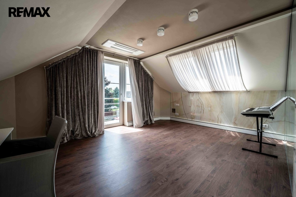 Chodba s balkonem, dva dětské pokoje se společnou terasou, koupelna s vanou, sprchovým koutem a WC. Dále je zde šatna s oknem, jedna ložnice a hlavní ložnice s balkonem a vlastní koupelnou (WC a sprchový kout). V patře je lištové vytápění a klimatizace v pokojích.