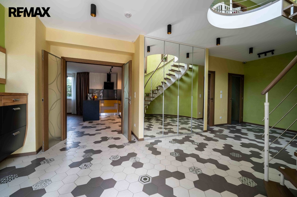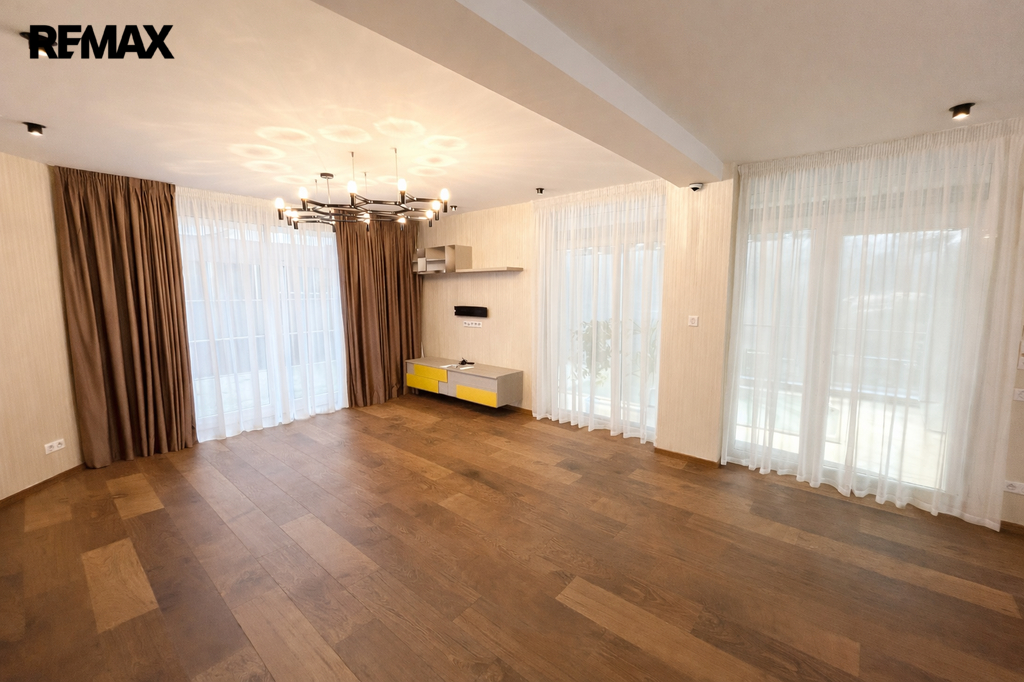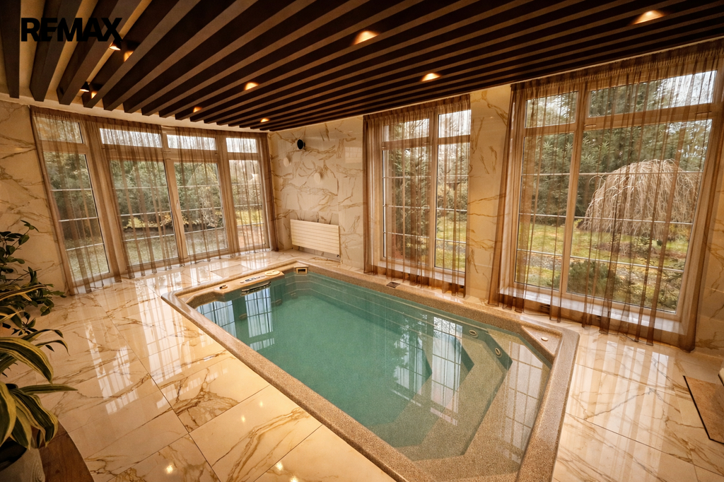 Vstupní hala o velikosti 25 m², obývací pokoj s krbem a kuchyňským koutem o celkové ploše 52 m². Z obývacího prostoru je vstup na terasu a do zimní zahrady s luxusním designovým bazénem s vířivkou. Součástí je koupelna se sprchovým koutem a WC. Vedle koupelny se nachází technická místnost s tepelným systémem Buderus.