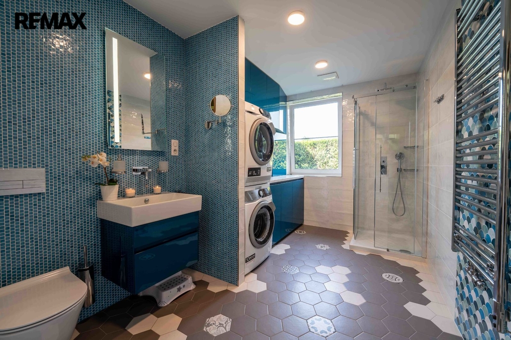 V přízemí je dále pracovna, koupelna s prádelní zónou, WC a sprchovým koutem. Z technické místnosti je vstup do garáže pro dvě auta, další dvě parkovací místa jsou před garáží. Přízemí je vybaveno podlahovým vytápěním a klimatizací v pokojích.