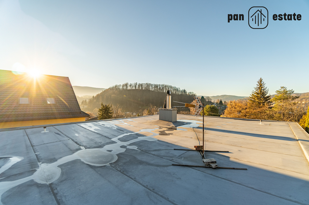 Na obývací pokoj navazuje rozsáhlá terasa plynule propojená s hlavním obytným prostorem i zahradou, nabízející ničím nerušené výhledy do okolní krajiny Jeseníků. Terasa tvoří přirozené prodloužení obytné části domu a významně zvyšuje komfort bydlení i kvalitu každodenního užívání nemovitosti.