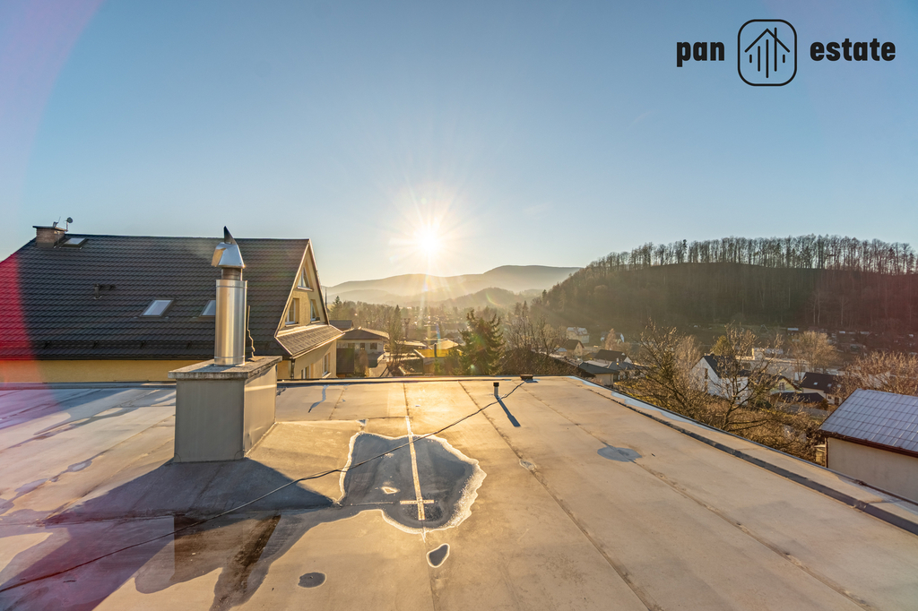 Na obývací pokoj navazuje rozsáhlá terasa plynule propojená s hlavním obytným prostorem i zahradou, nabízející ničím nerušené výhledy do okolní krajiny Jeseníků. Terasa tvoří přirozené prodloužení obytné části domu a významně zvyšuje komfort bydlení i kvalitu každodenního užívání nemovitosti.