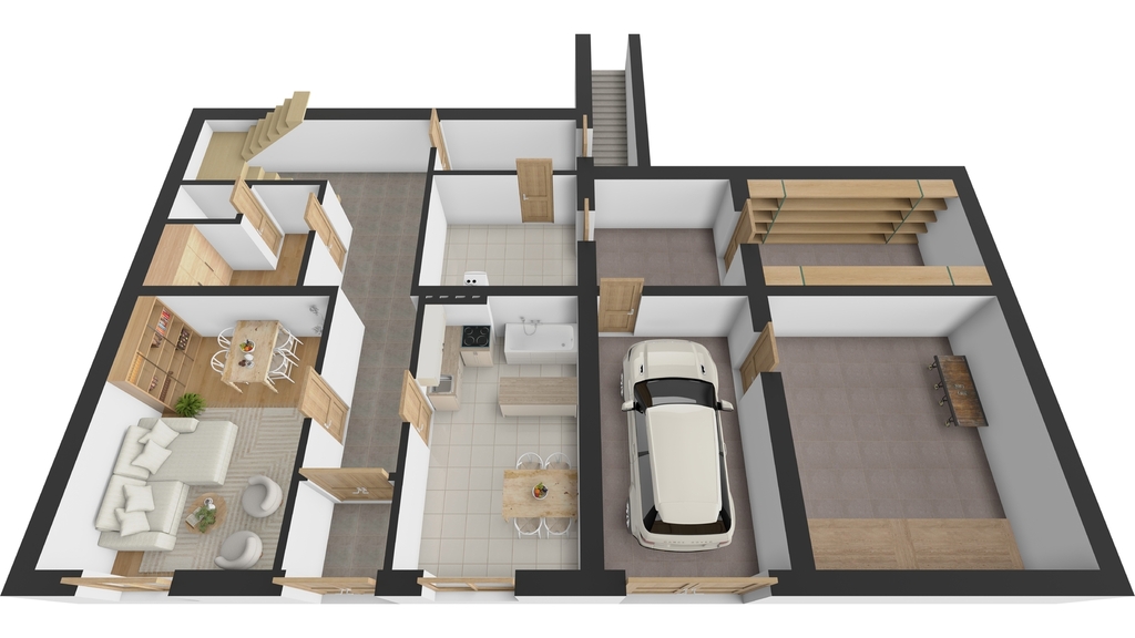 Dispozice domu je praktická a nabízí variabilní využití jednotlivých podlaží. Nižší podlaží, částečně zapuštěné do terénu, tvoří garáž, technické a skladovací prostory, prádelna, samostatné WC, větší pokoj a další místnost vhodná jako pracovna, dílna nebo budoucí obytný prostor. Toto podlaží nabízí zajímavý potenciál pro vytvoření samostatné obytné části, zázemí pro hosty, práci z domova nebo budoucí pronájem. Hlavní obytné podlaží je koncipováno jako plnohodnotná obytná zóna a zahrnuje prostornou kuchyň s jídelním koutem, světlý obývací pokoj, ložnici, dva samostatné pokoje, koupelnu s vanou a samostatné WC.