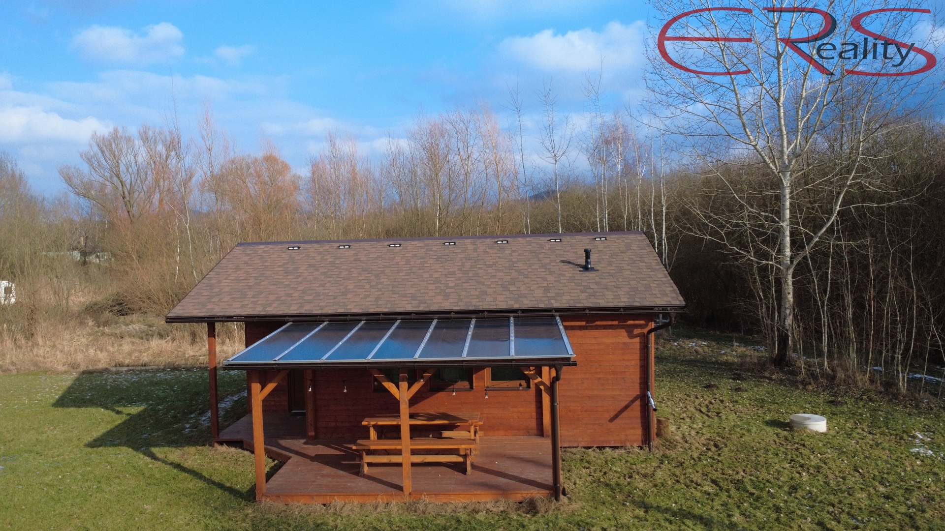 Chata má zastavěnou plochu cca 57 m² a dispozici 3+kk: obytný prostor s kuchyňským koutem + 2 ložnice, koupelna s WC a krytá terasa. Objekt je zateplený a vytápěný, takže celoroční využití není jen marketingová pohádka.