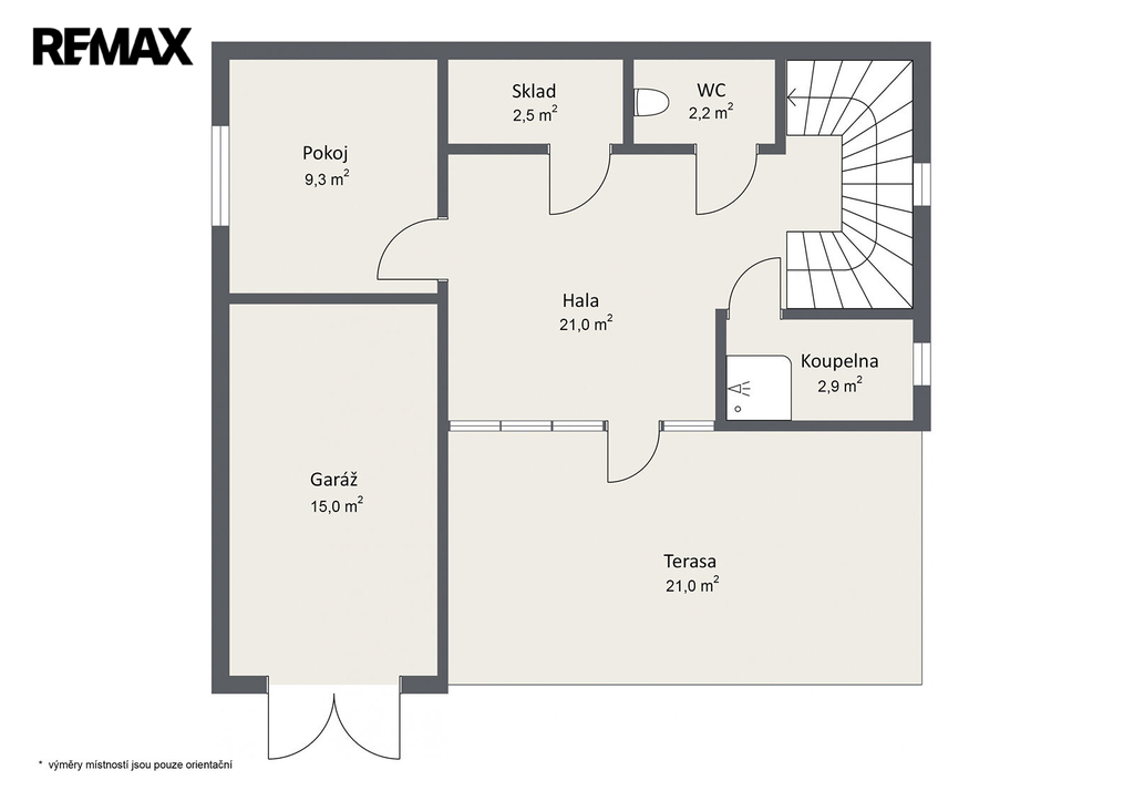 Přízemí: prostorná obytná hala s francouzskými okny a vstupem na terasu a zahradu, pokoj pro hosty či samostatné bydlení, koupelna, toaleta, komora.