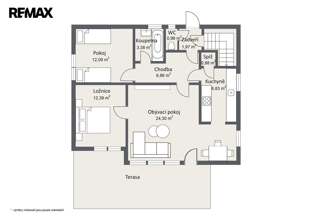 1. patro: obývací pokoj (24 m²) s jižní terasou a výhledem do zeleně, samostatná kuchyň, dvě ložnice, koupelna, toaleta, spíž.