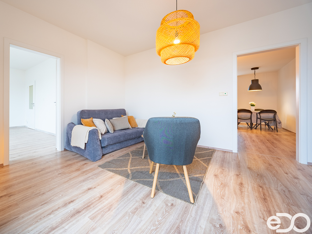Obývací pokoj i ložnice jsou propojené, zároveň však mají každý vlastní vstup, takže dispozice umožňuje jejich samostatné využití. Z obou těchto místností je přímý vstup na terasu. Byt je přístupný z pavlače s příjemným výhledem na dominantu města – Valdickou bránu.