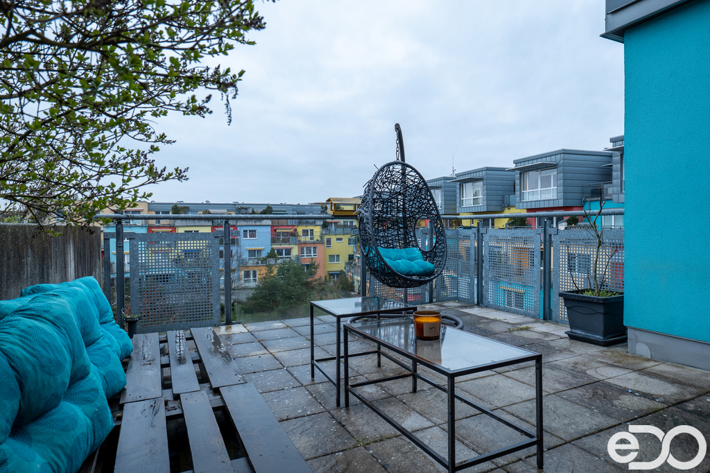 Plocha bytu činí téměř 90 m² (bez sklepu a terasy), což je v této kategorii opravdu výjimečné. Dominantou je velkorysá kuchyně o velikosti cca 25 m², která nabízí dostatek prostoru nejen pro vaření, ale i pro každodenní rodinný život. Na byt navazuje prostorná terasa o výměře cca 17,5 m² se západní orientací, ideální pro odpočinek i večerní posezení.