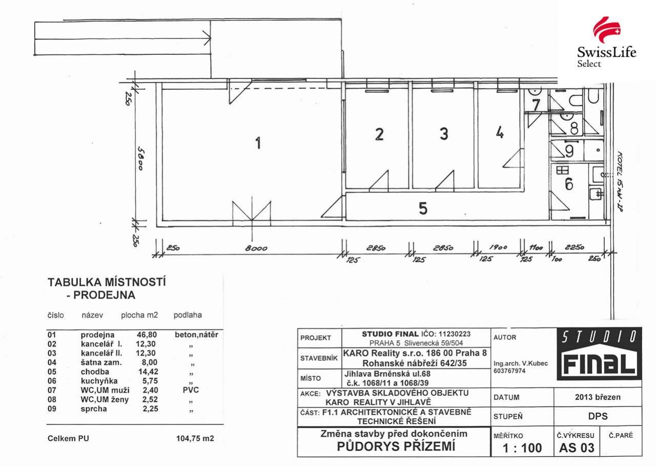 Jsou zde 3 kanceláře, kuchyňka a sociální zázemí (WC a sprcha). Dále je zde i vstupní prostor pro zákazníky. Půdorys této části haly je ve fotografiích.
