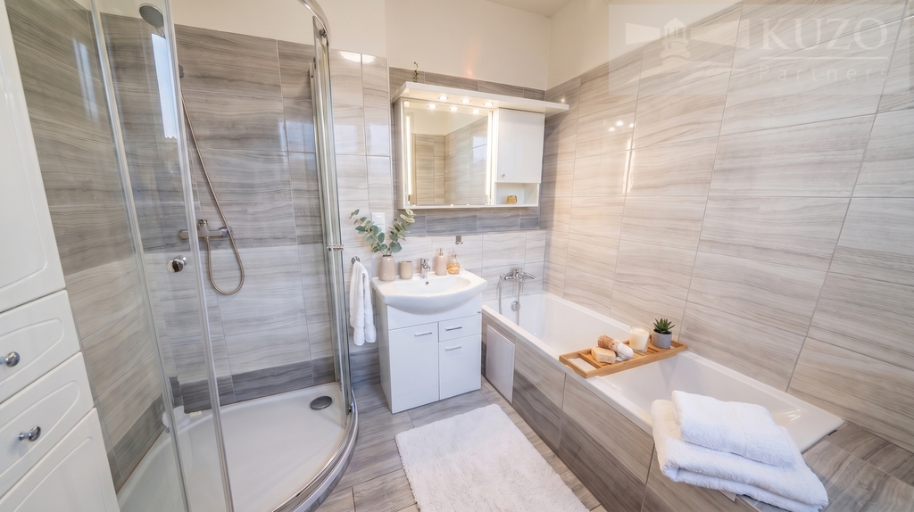 Dominantou je bezesporu nadstandardně řešená koupelna, kde najdete jak vanu pro relaxaci, tak i samostatný sprchový kout pro rychlé osvěžení. To je komfort, který v podobných bytech jen tak nenajdete.