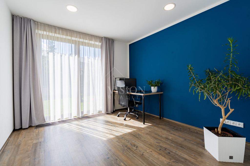 V 1. NP se nachází prostorný obývací pokoj s kuchyní a dvěma vstupy na zahradu, pracovna rovněž se vstupem na zahradu, technická místnost a prádelna se sprchovým koutem.