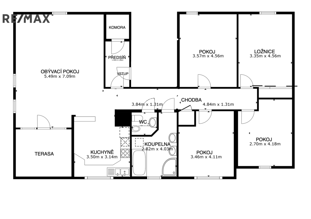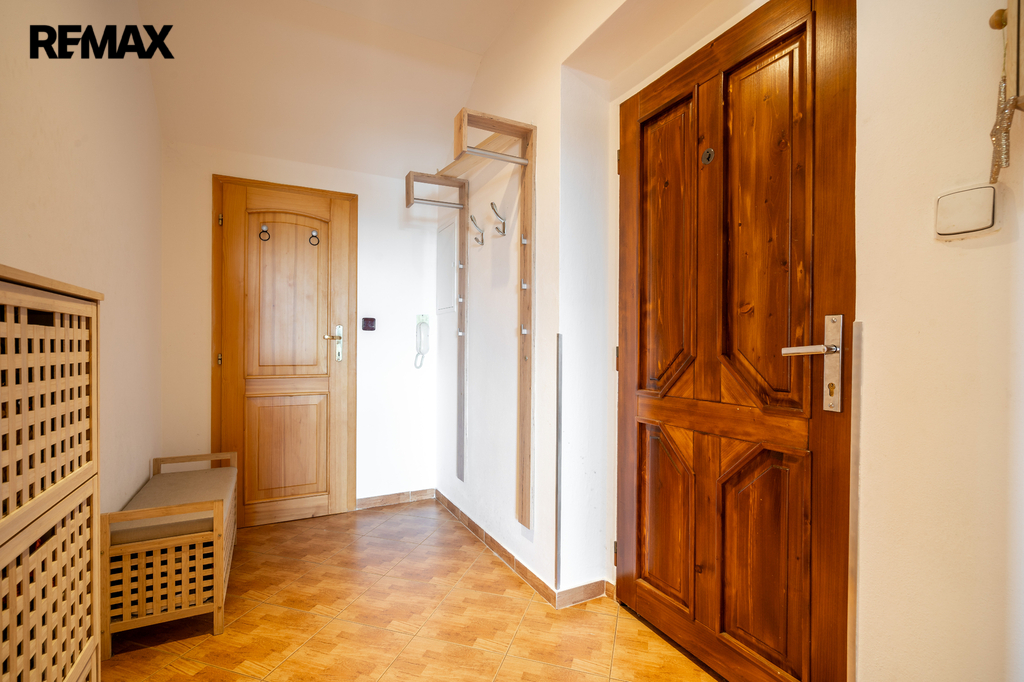 Byt má k dispozici zádveří, velkou halu se samostatnými vstupy do pokojů, dvě komory, nadstandardně velkou koupelnu a další samostatné WC.