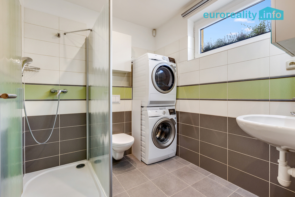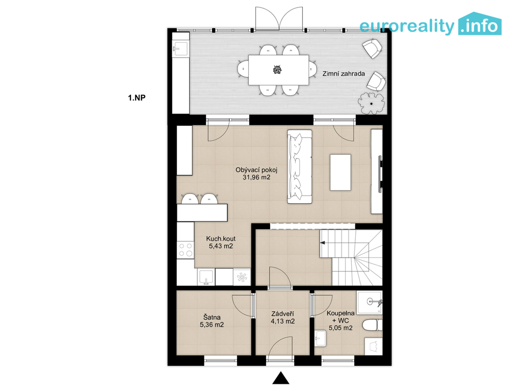 Přízemí: obývací pokoj s jídelnou (32 m²) a kuchyňským koutem (5 m²), kde se vaří i ty nejlepší nedělní řízky. K tomu koupelna se sprchovým koutem, technická místnost, zádveří a jako bonus zimní zahrada (21 m²) – celoročně obyvatelná, s klimatizací, ideální na grilovací afterparty nebo zimní čtení s čajem, nebo každodenní posezení s rodinou.