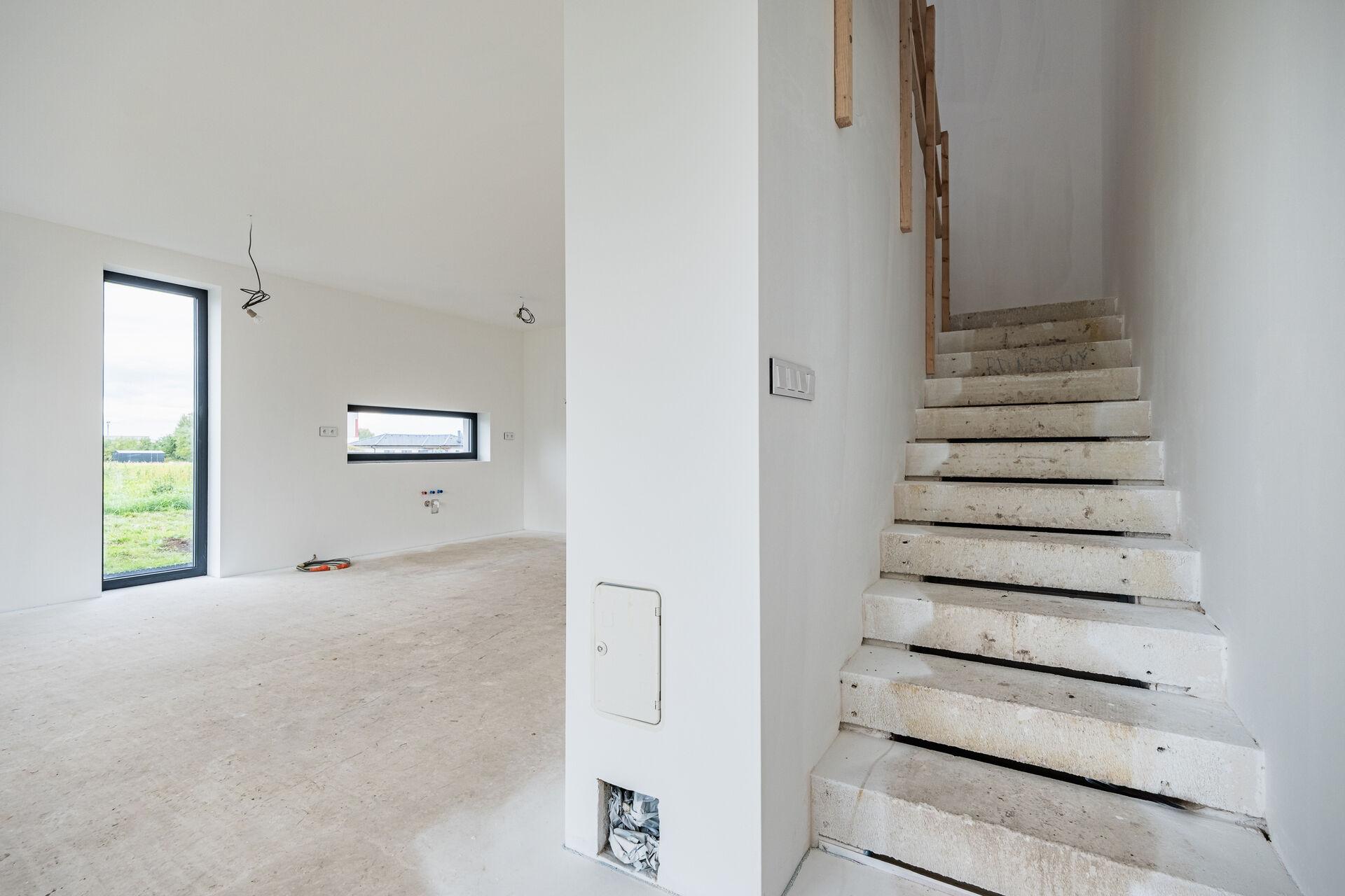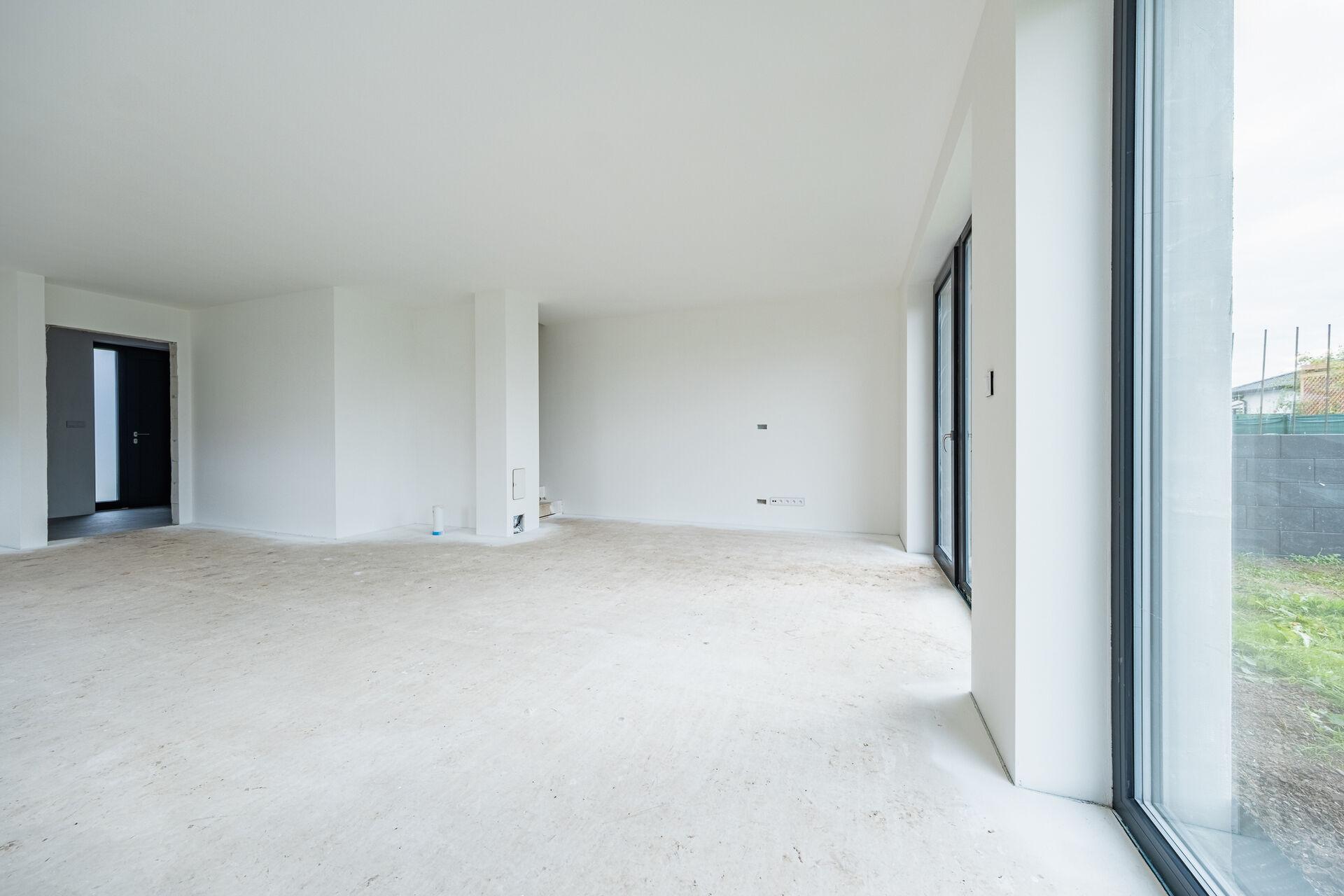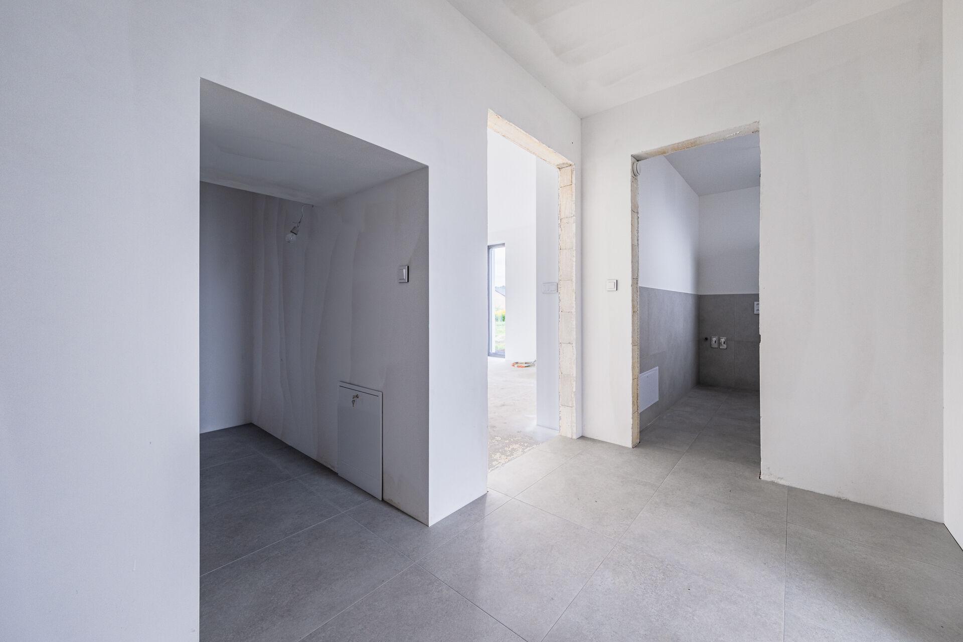Uvnitř domu vás přivítá otevřený obývací prostor s kuchyňským koutem, jehož velká okna propouštějí dostatek denního světla a propojují interiér s terasou a zahradou – ideálním místem pro relaxaci, dětské hry nebo letní grilování. Kuchyňský kout je připraven pro realizaci vaší vysněné kuchyně na míru.