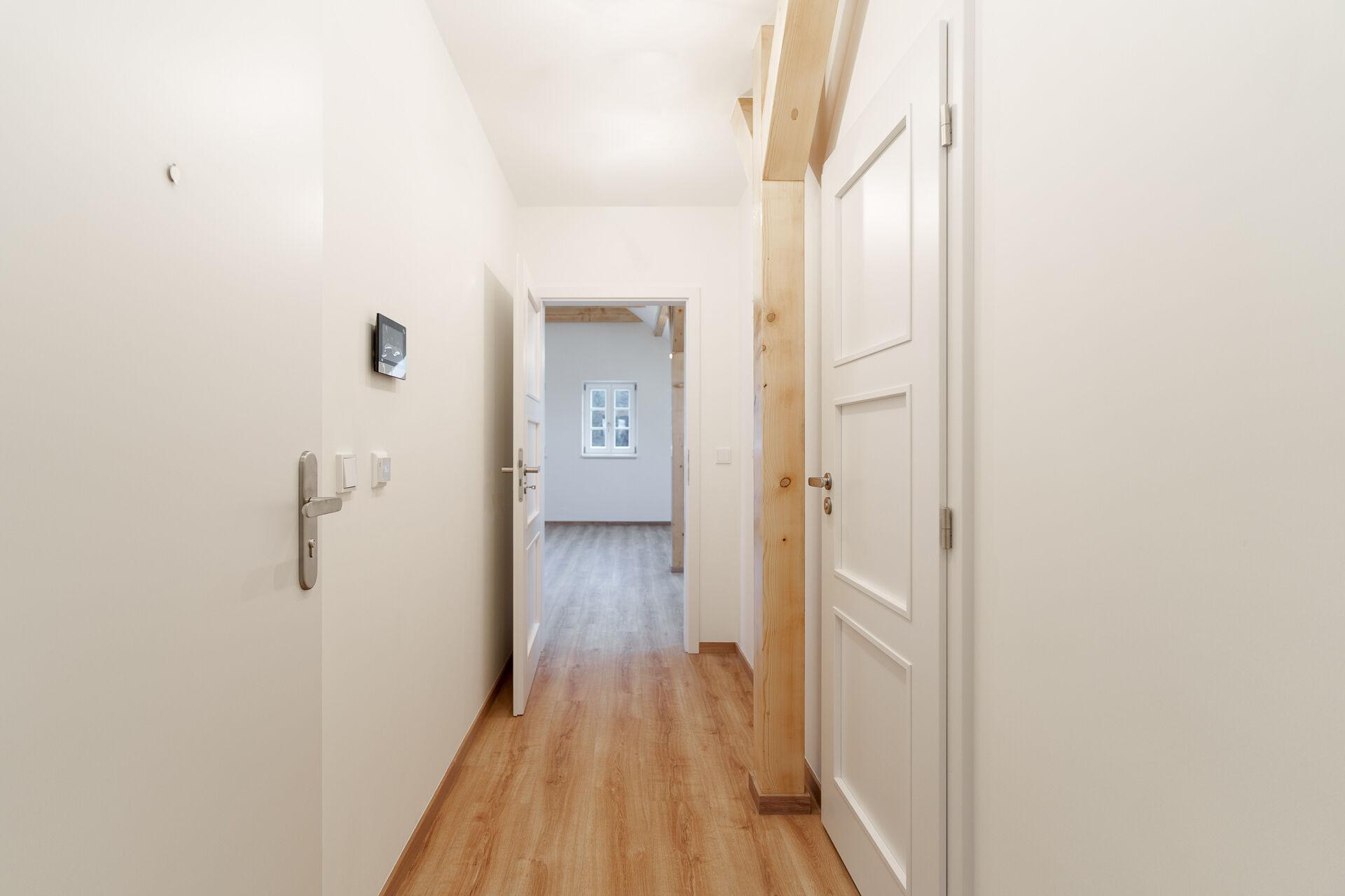 Vytápění je elektrické podlahové s Wi-Fi termostaty, podlahy tvoří vinyl v dekoru dubu a velkoformátová dlažba v jemných béžových tónech. Podkrovní jednotky jsou navíc vybaveny klimatizací pro vyšší komfort v letních měsících. K apartmánu náleží také sklepní kóje a venkovní parkovací stání.