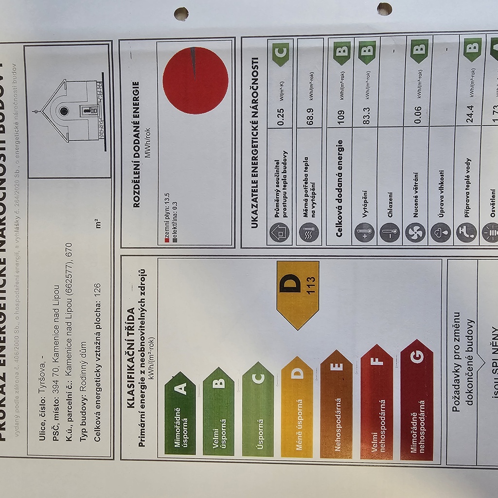 - Ukazatel energetické náročnosti budovy: 113 kWh/m²