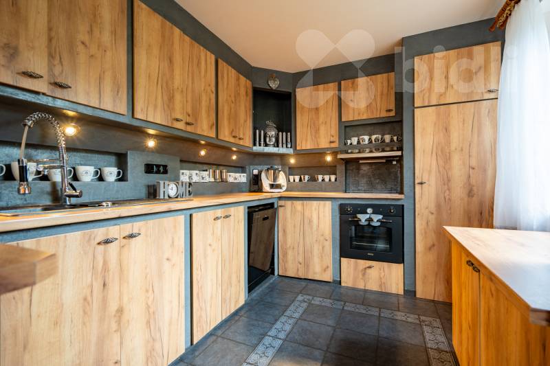 Kuchyň je vybavena kvalitními vestavěnými spotřebiči, jako je elektrická trouba, varná deska, digestoř a myčka nádobí.