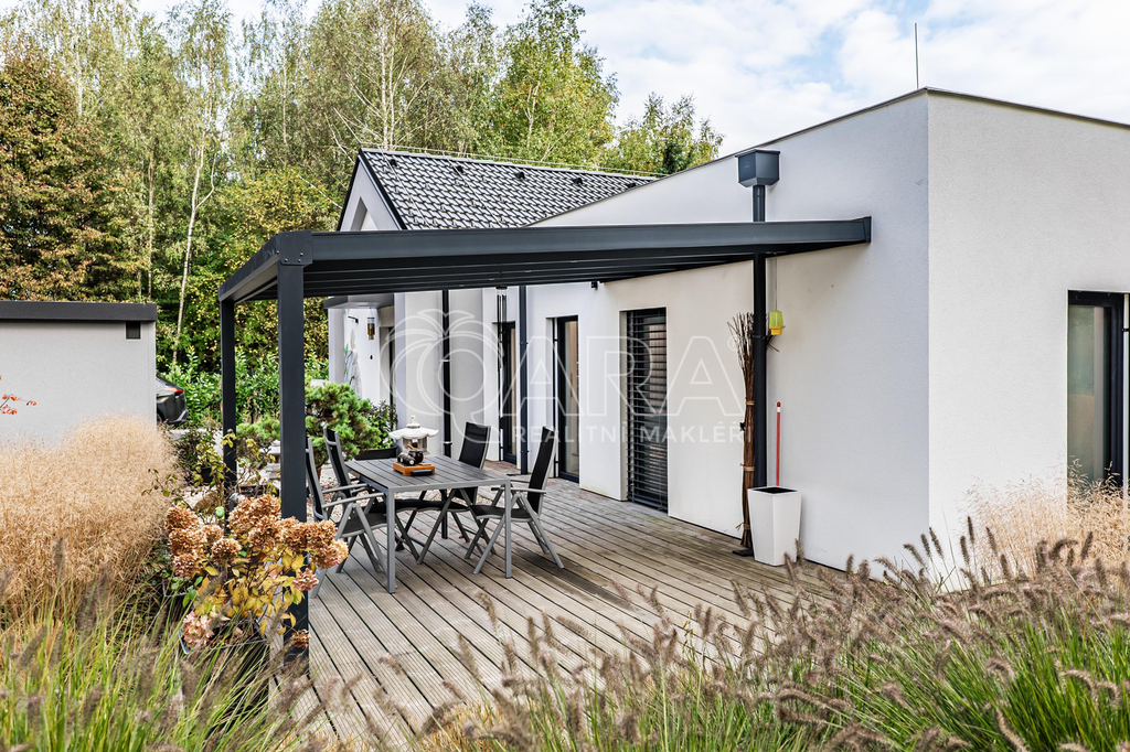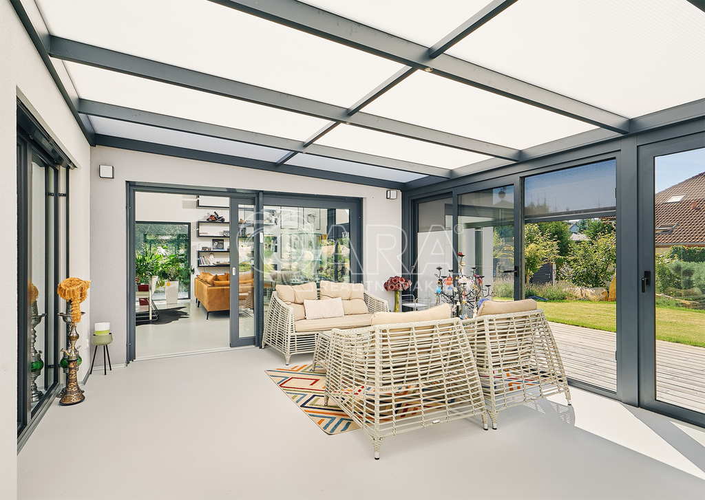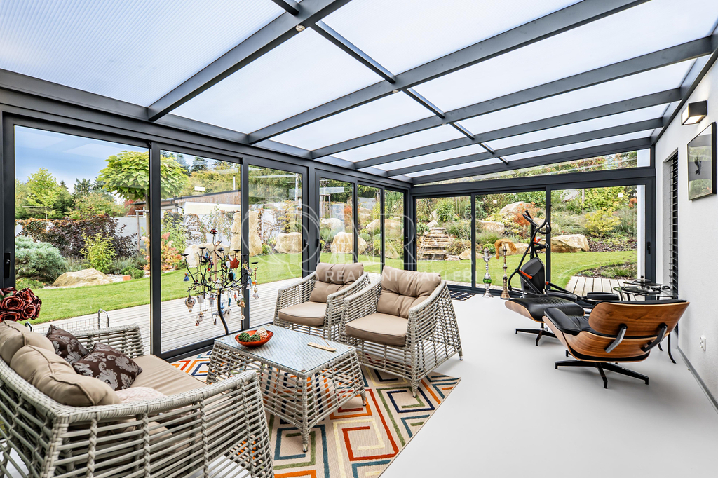 Celoroční využití (jídelna / relaxační zóna), podlahové vytápění, přímý vstup na zahradu, dálkově ovládané stínění ISOTRA